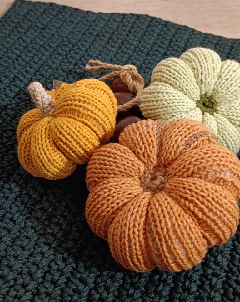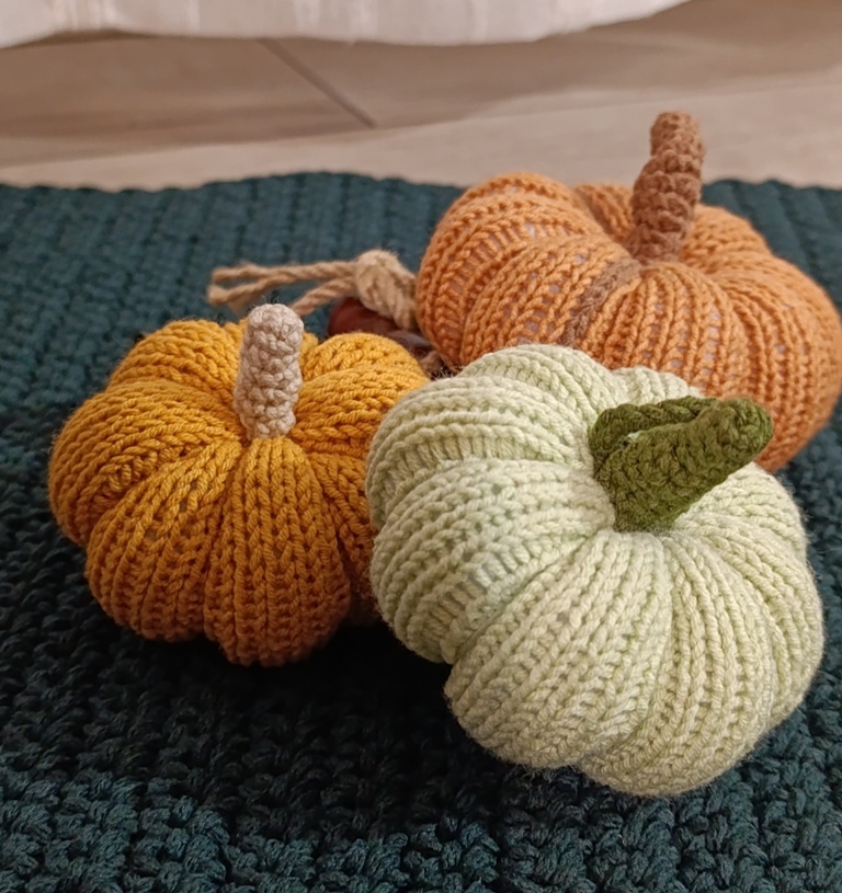 Dýně jsou pletené z bavlněné příze, stopky jsou háčkované a dýně jsou vyplněné dutým vláknem.