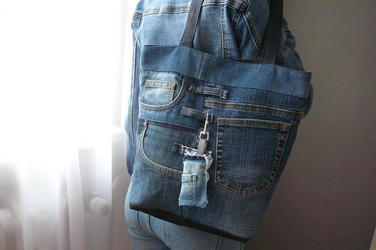 Kabelka ušitá z džínové recyklované látky, doplněná elementy z reci džínoviny. Vepředu jsou 2 kapsy zachované od původních riflí. Zapínání na magnet.