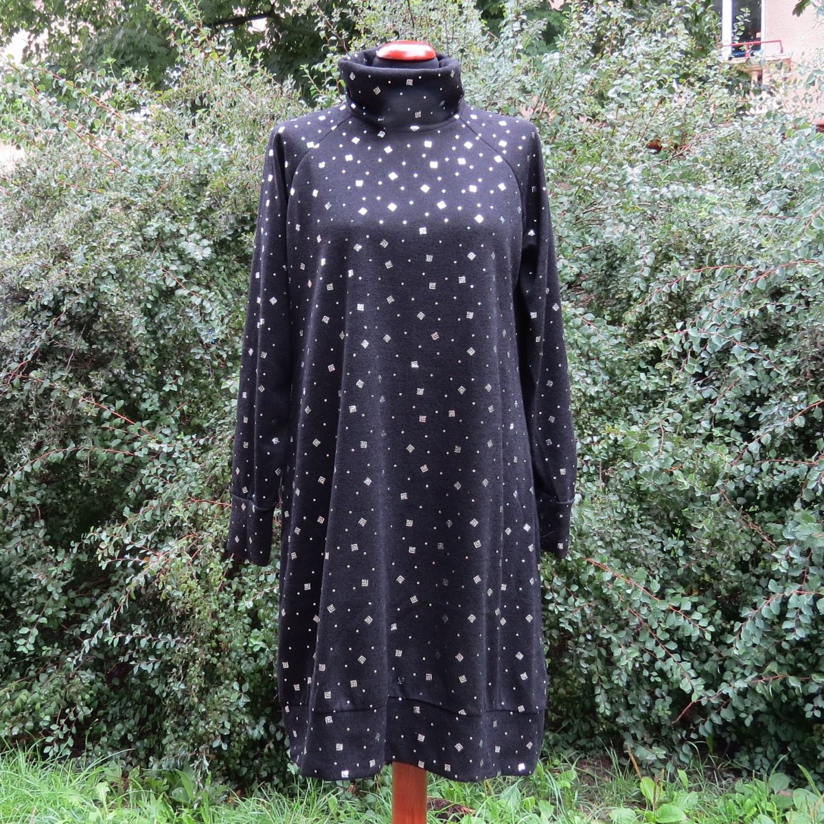 Mikinošaty z černé svetroviny se stříbrným vzorkem, který působí velmi elegantně. Mají rolák, spodní okraj a rukávy jsou stažené do manžety.