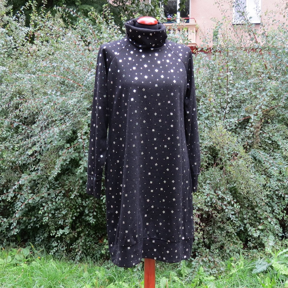 Rozměry: horní obvod = 104 cm, boky = 106 cm, délka rukávu od krku včetně manžety 72 cm, délka šatů včetně manžety dole 94 cm. Dobře padnou ženám, které nosí konfekční velikost 42.