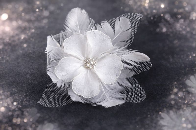 Tato elegantní květinová spona do vlasů v jemných odstínech tyrkysové a bílé je nádherným doplňkem pro slavnostní příležitosti. Květ z lehkého textilu je doplněn průzračnými korálky a jemnými pírky, které dodávají celému designu vzdušnost a romantický charakter. Spona perfektně drží v účesu a snadno se kombinuje se svatebními či společenskými šaty.