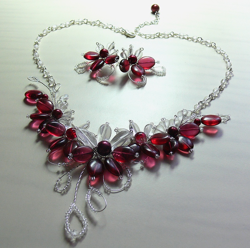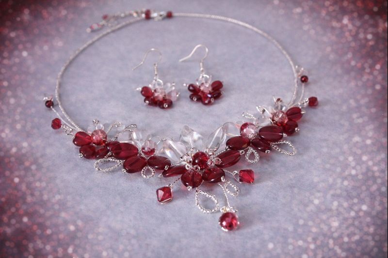 ručně vyráběný náhrdelník s červenými skleněnými korálky, náhrdelník a náušnice pro slavnostní příležitost, elegantní šperk k večerním šatům, svatební náhrdelník s červenými skleněnými korálky, společenský náhrdelník ruční práce, luxusní náhrdelník pro ženy, šperk k šatům se širšími ramínky, dámský náhrdelník, náušnice ruční výroba, originální šperk, česká ruční výroba, slavnostní šperky