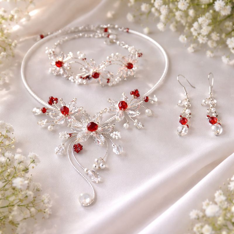 Výrazný, přesto jemný ručně vyráběný šperkový set v kombinaci čirých skleněných broušených korálků, pereliček a sytě červených detailů je ideální volbou pro slavnostní a společenské příležitosti. Květinový motiv působí romanticky a luxusně zároveň a krásně vynikne zejména v kombinaci s červenými nebo večerními šaty.