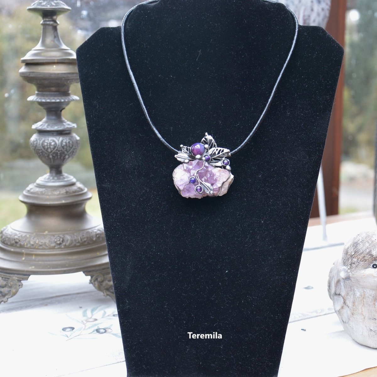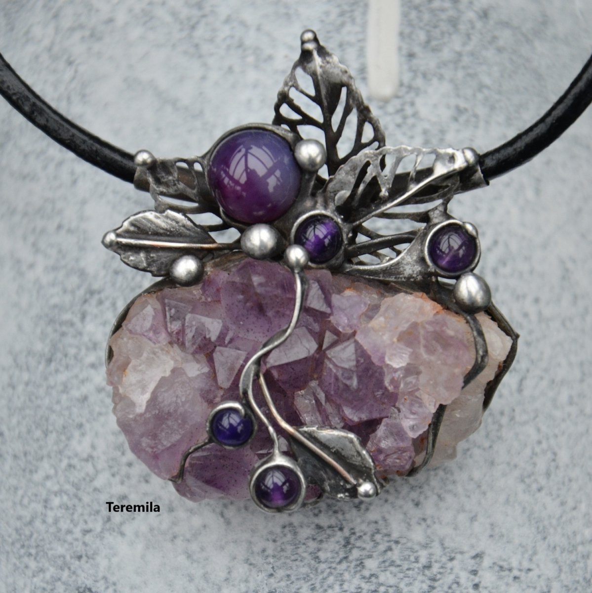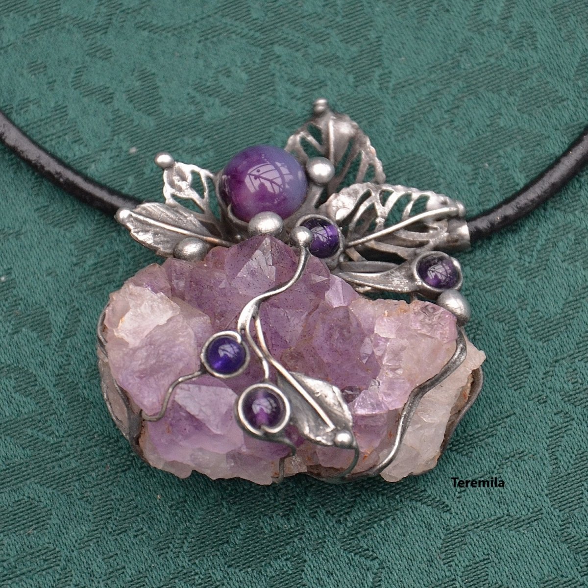 Šperk je vyroben cínováním. Je tvořen překrásnou drúzou sytě fialového ametystu. Krystaly jsou veliké a vystupují do výšky. Kámen je velký 4,5 x 3 x 1,8 cm, a proto je šperk plastický. Všechny další doplňky šperku jsou rovněž ametysty. Spodná strana kamene je kryta, aby nedošlo k poškození oděvu.