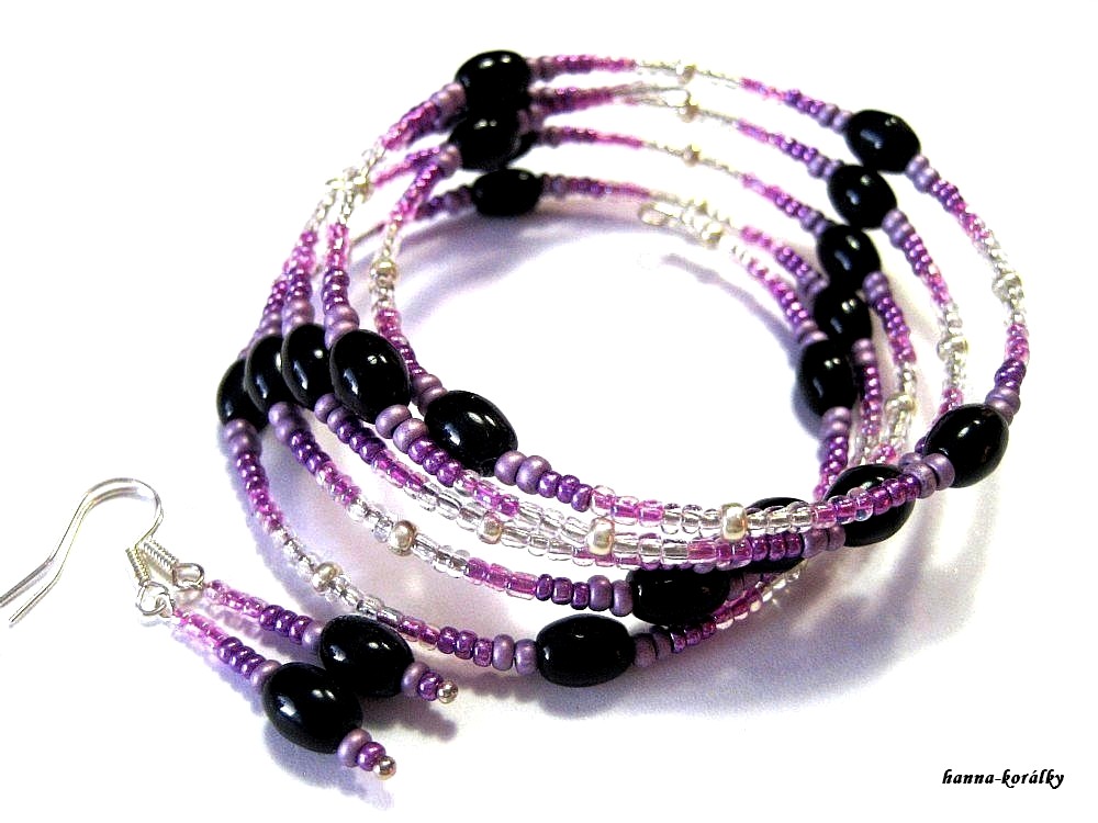 Náušnice a náramek z rokajlu a skleněných korálků v barvě černé, fialové a bílé čiré - na paměťovém drátu, který se na ruku nasazuje velmi jednoduchým namotáváním