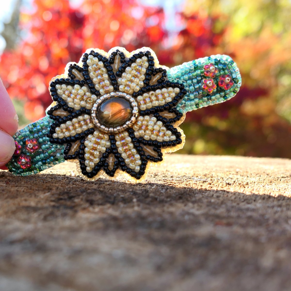 Spona do vlasů vyšívaná, uprostřed je oválek labradoritu se žlutou labradorizací. Jedná se o přírodní kámen z Madagaskaru.