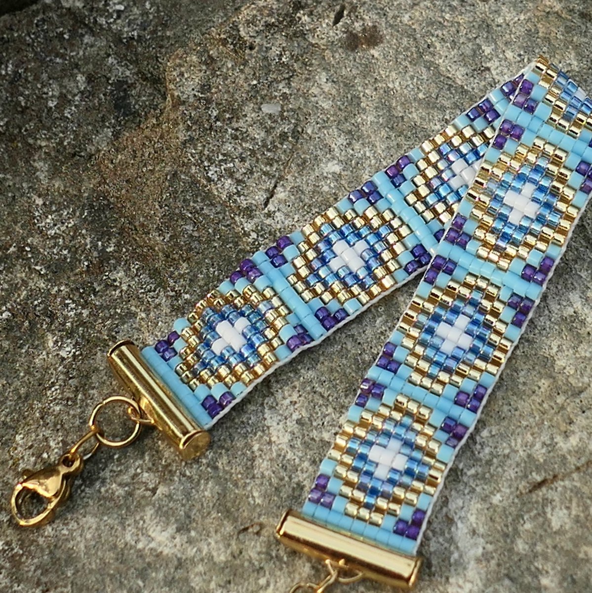 Ručně tkaný náramek z luxusního japonského Miyuki rokailu - světle modrá, modrá, fialová, bílá a zlatá, geometrický vzor.