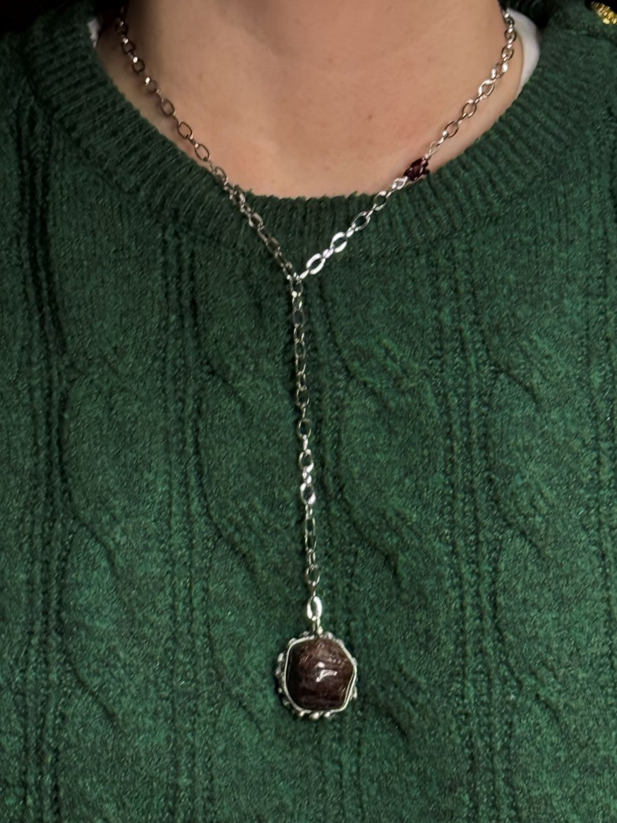 Náhrdelník z afrického GRANÁTU na řetízku z chirurgické oceli. Drobné kamínky granátu jsou vložené přímo do řetízku v horní části u krku.