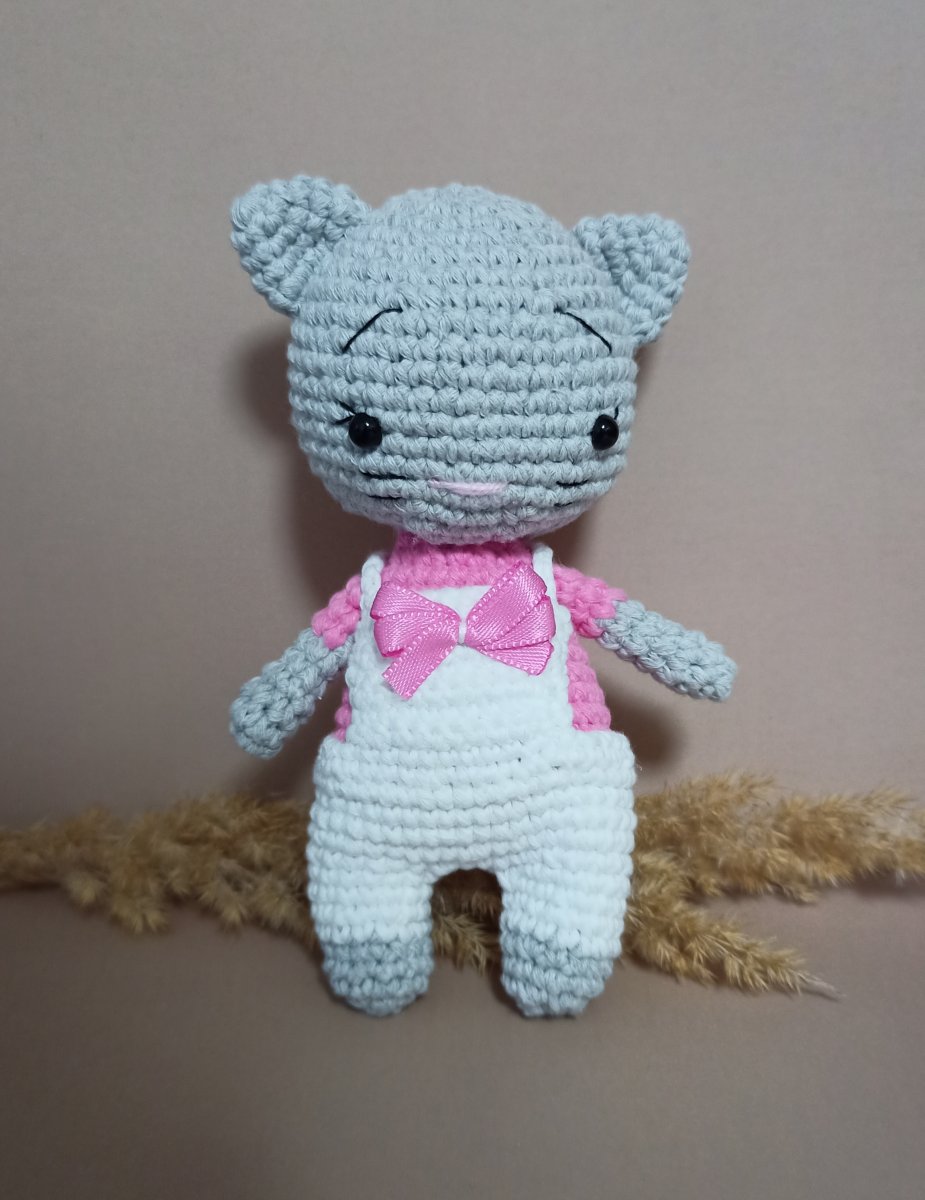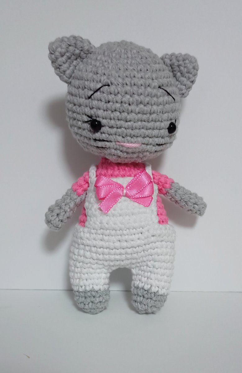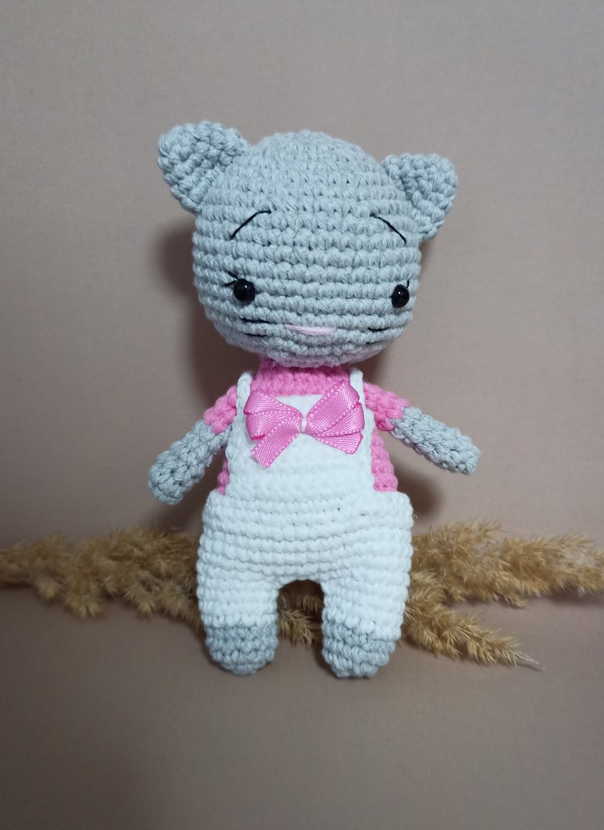 Roztomilá ručně háčkovaná kočička s celkovou výškou 14,5 cm, která potěší malé i velké.