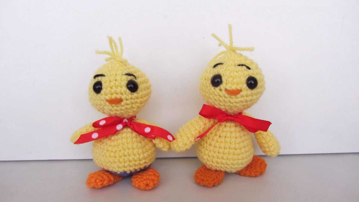 Háčkovaná kuřátka z akrylové příze. Kuřátka mají bezpečnostní oči, jsou vyplněná PES kuličkami, Jedno kuřátko má kalhotky ve fialové barvě. Velikost kuřátka je 12 cm.