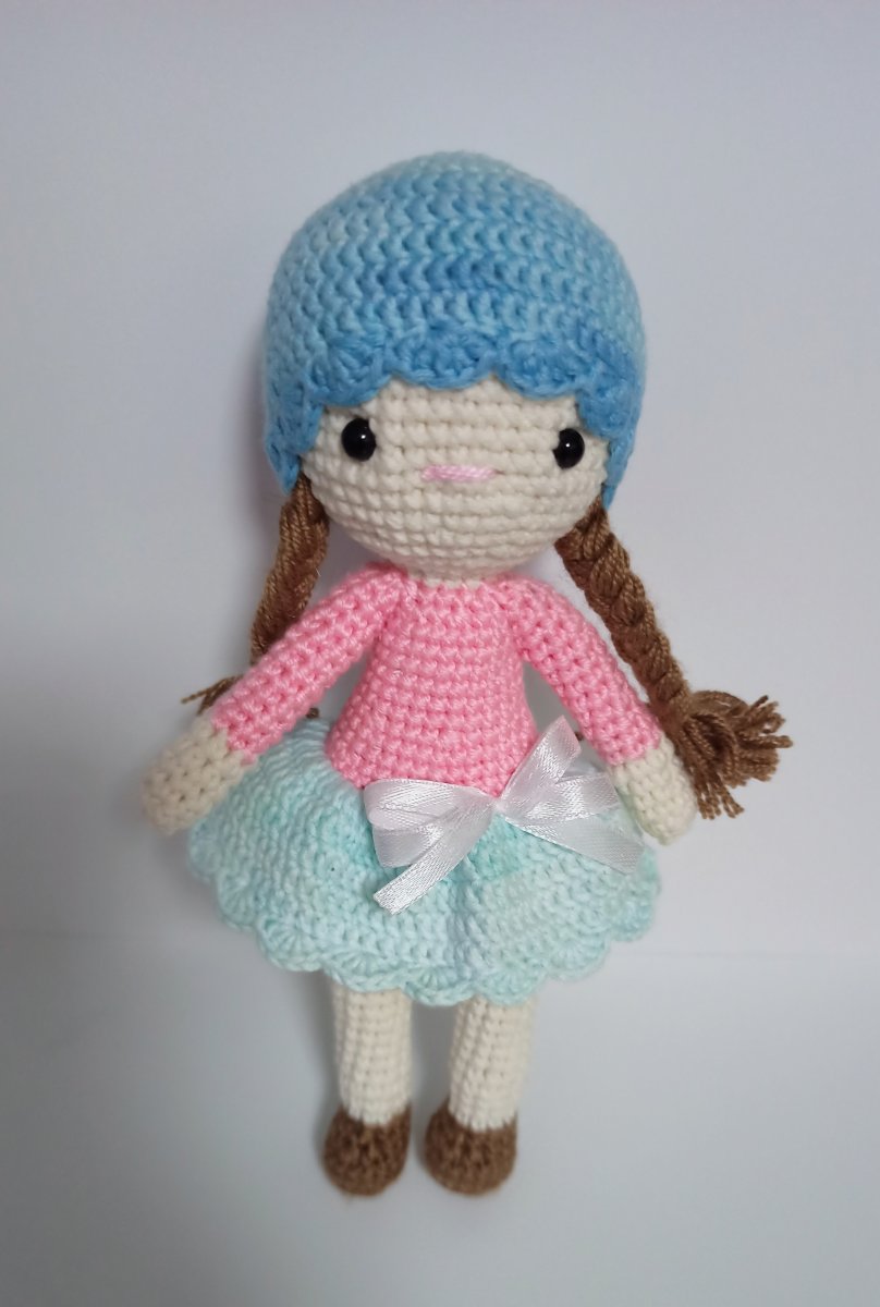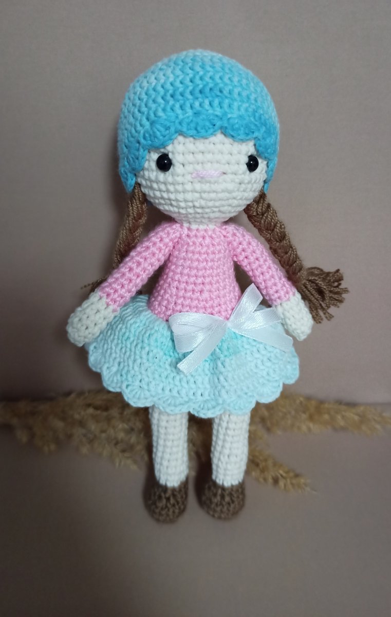Ručně háčkovaná panenka s celkovou výškou 20 cm.