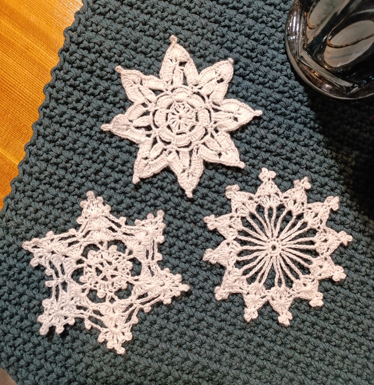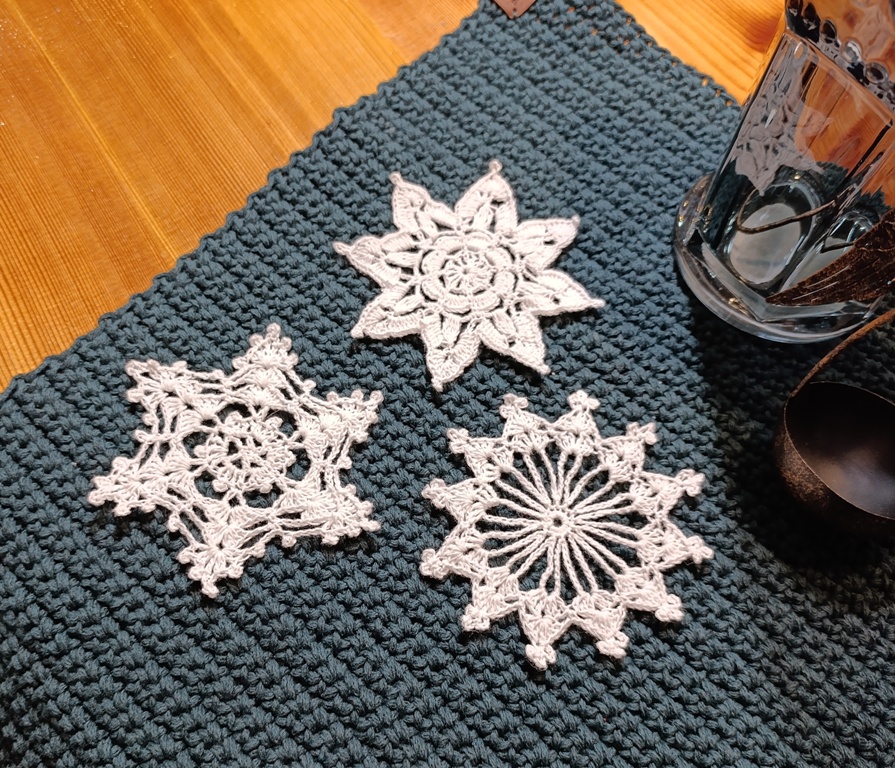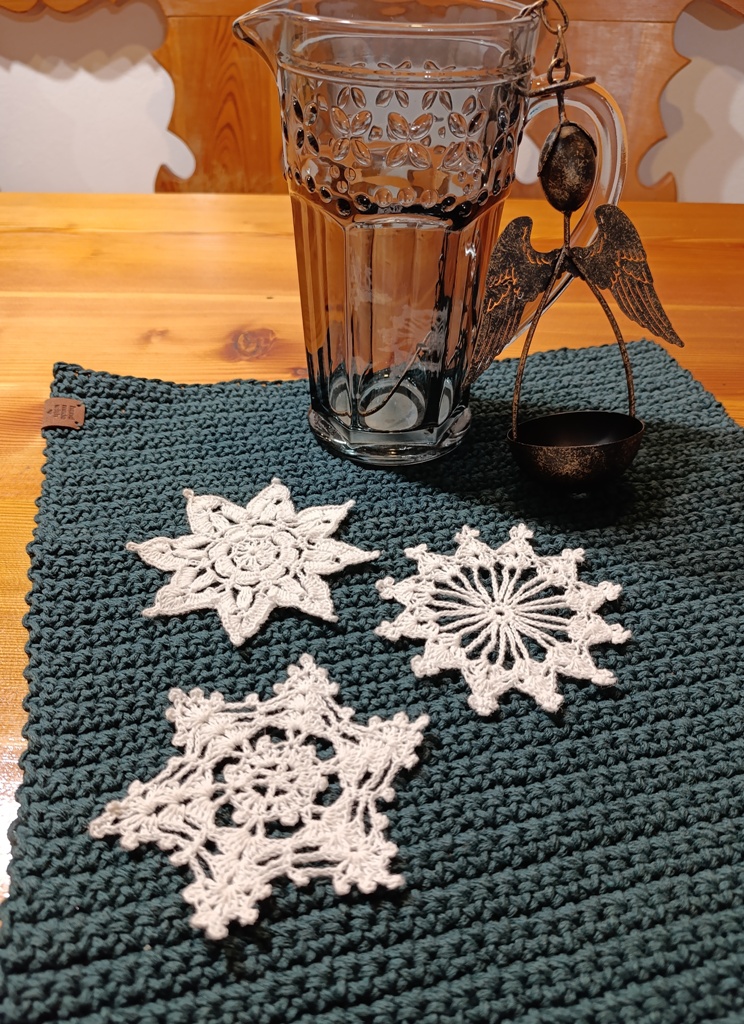 Háčkovaná vločka z tenké bavněné příze. Každá vločka je naškrobená a vypnutá, aby držela tvar.