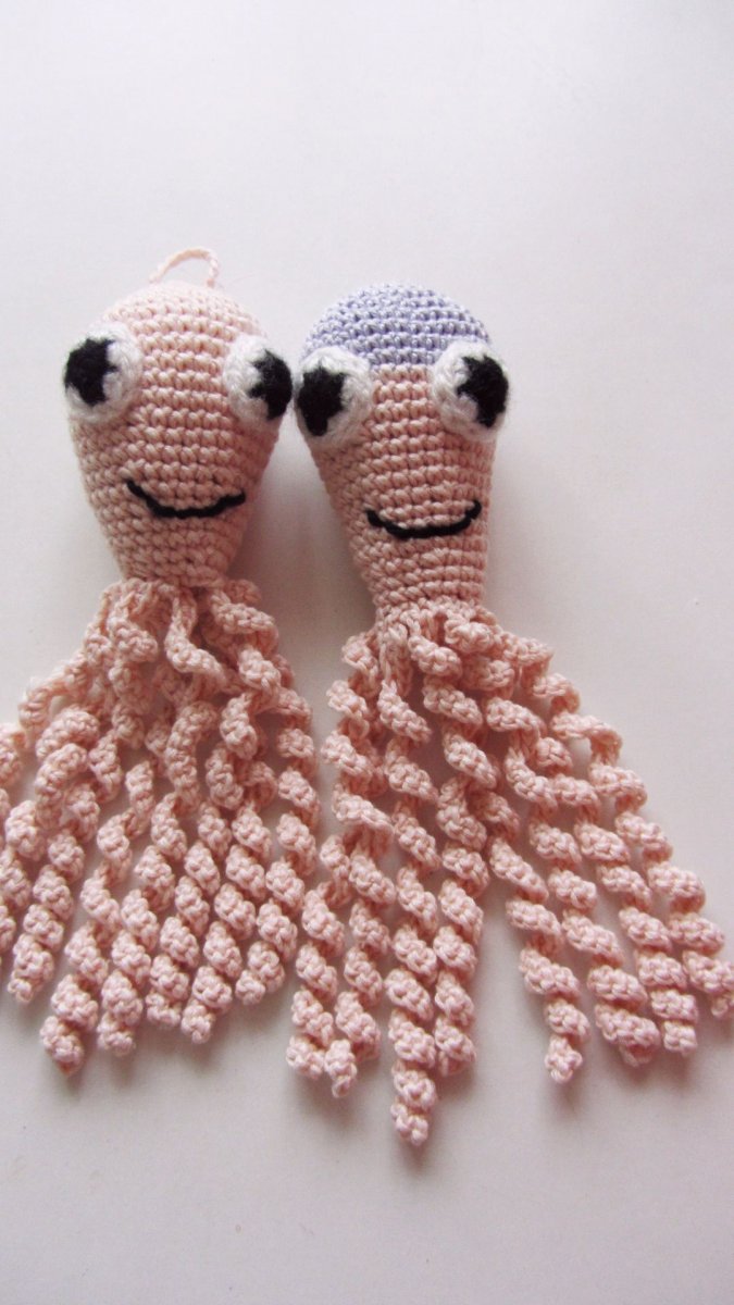 Háčkované chobotničky jsou zhotoveny z bavlněné příze,vyplněné PES kuličkami, které jsou hypoalergenní. Chobotničky mají poutko na zavěšení. Velikost chobotničky je 20 cm.