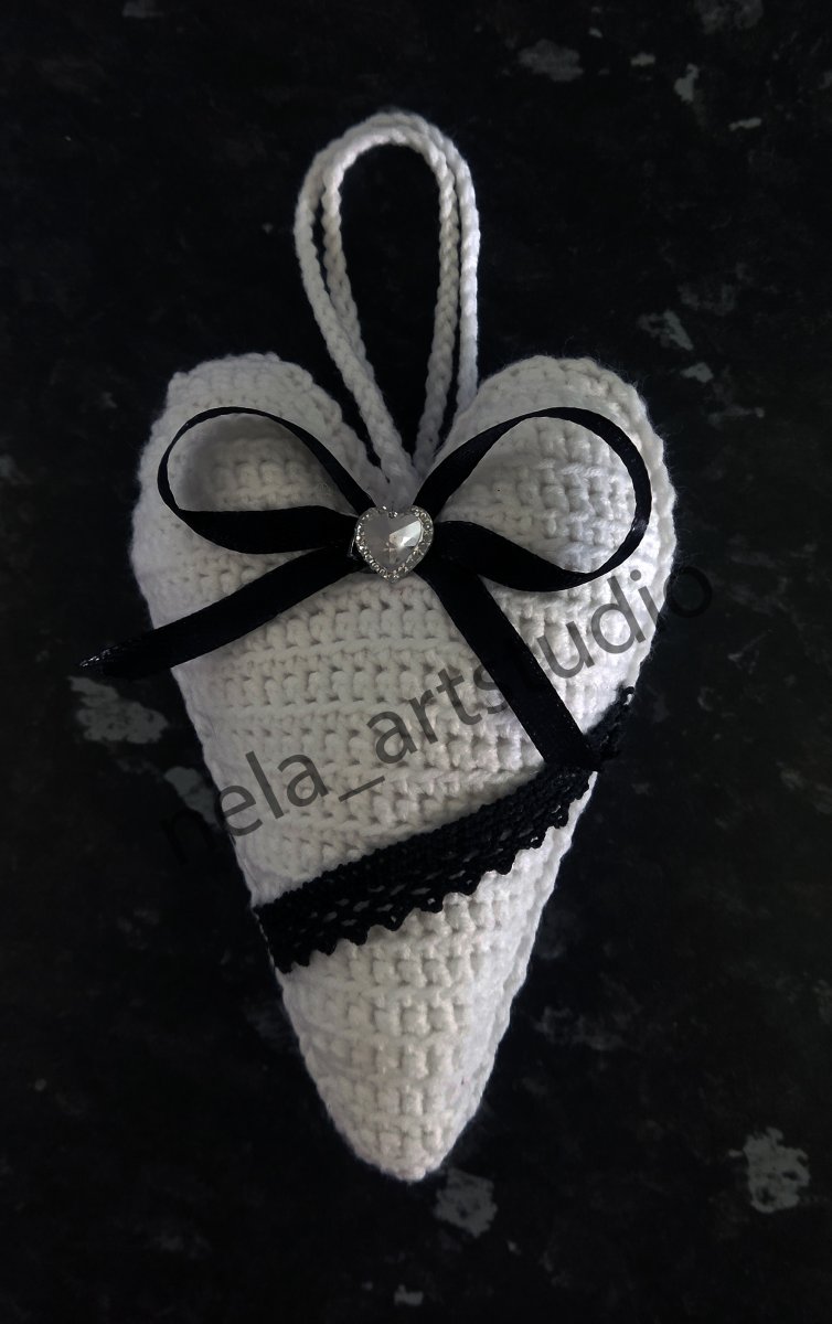 Vyplněno dutým vláknem. Zdobeno atlasovou stuhou 6mm, broušeným srdcem a bavlněnou paličkovanou krajkou a řetízkovou šňůrkou na zavěšení.