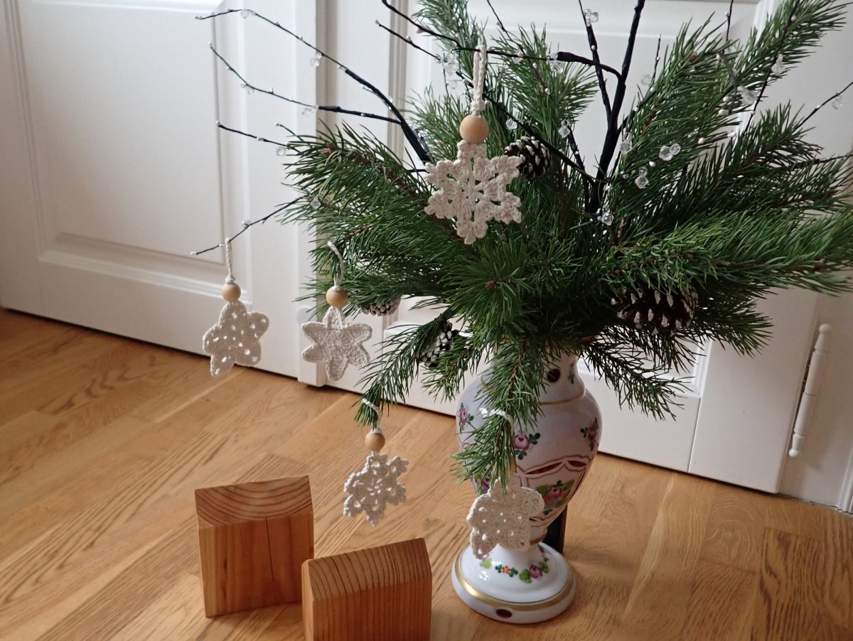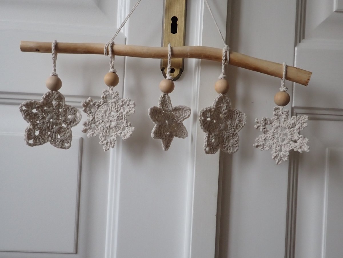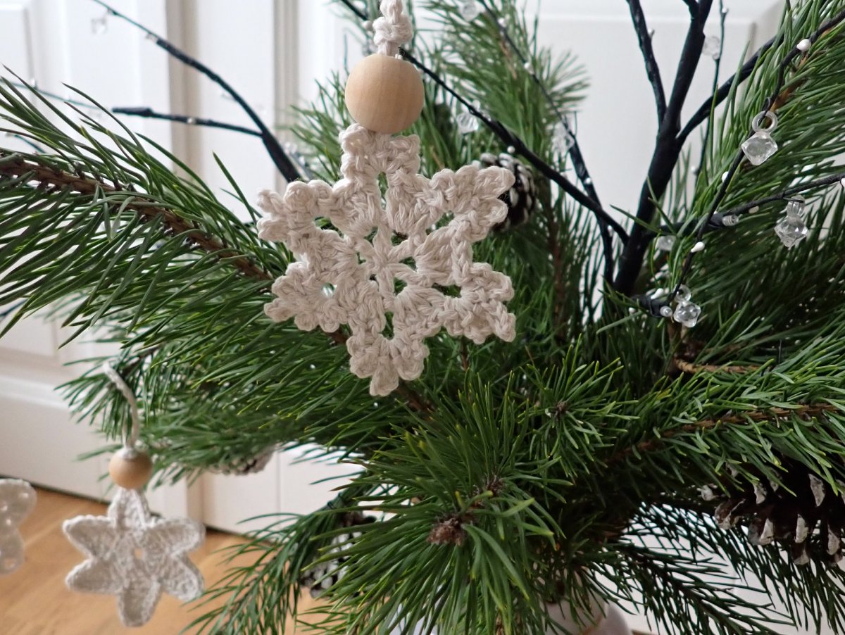 Pevné přírodní dekorace - vločky jsou uháčkované z bavlněného provázku a doplněné přírodním dřevěným korálkem.
