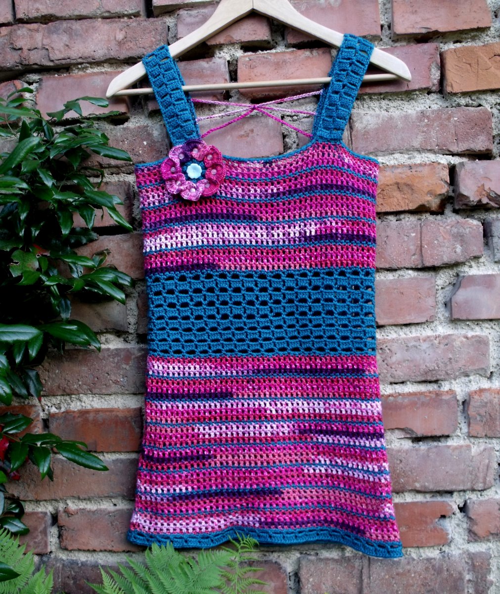 Top se mírně rozšířuje, má široká ramínka. Na předním dílu je ozdoben háčkovanou kytkou s korálky a na zadním je šněrování.
