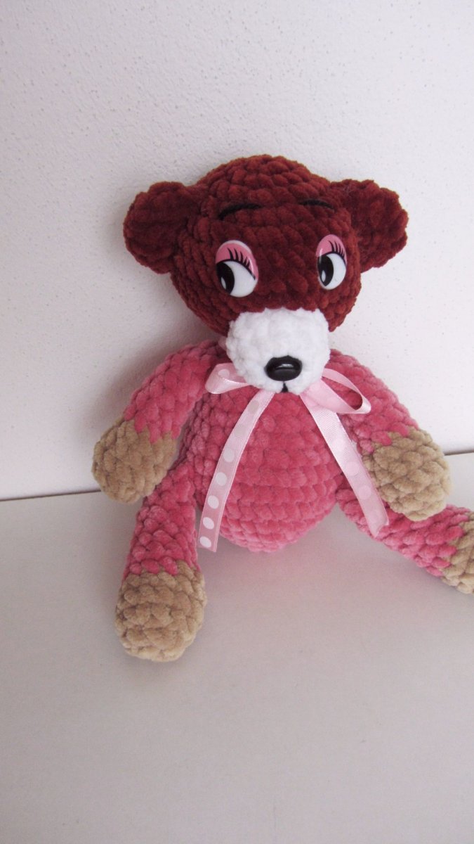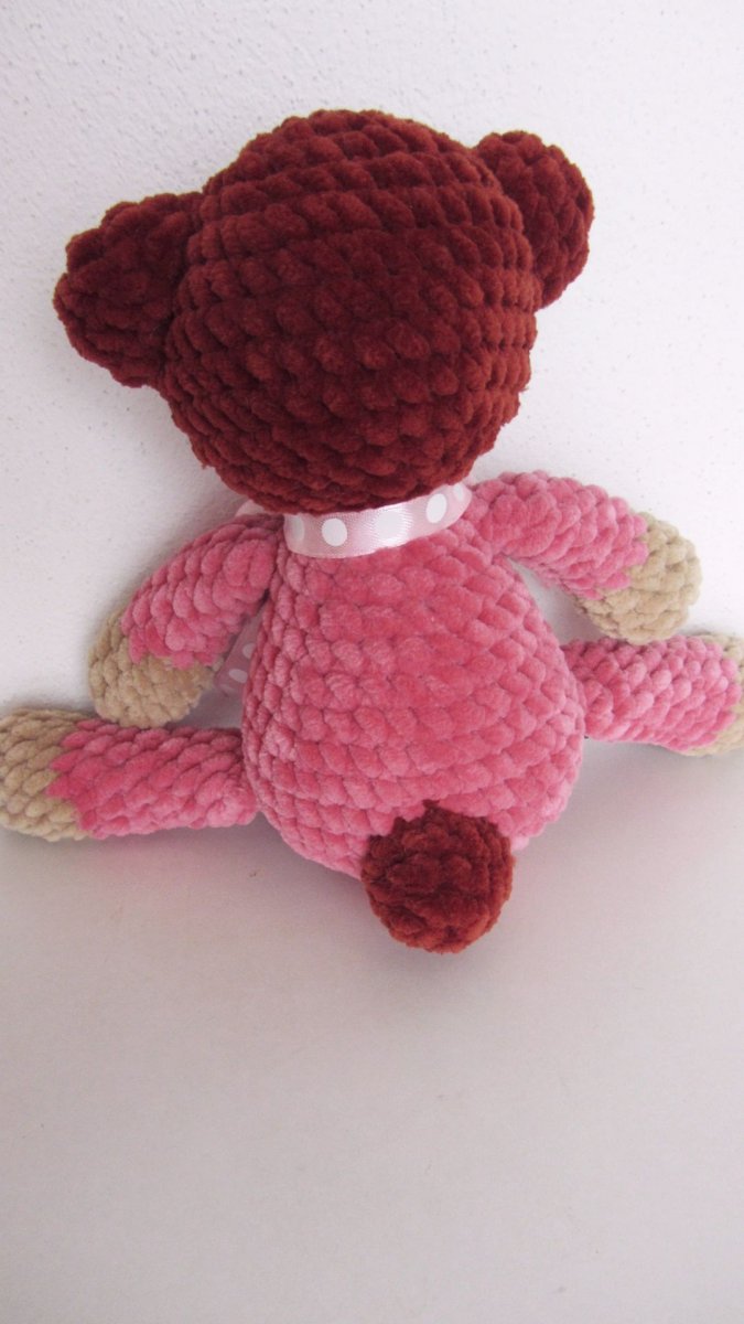 Háčkovaná hračka medvídka Laury je zhotovena z polyesterové příze. Medvídek má bezpečnostní oči a bezpečnostní nos, kolem krku má uvázanou mašličku. Je vyplněný PES kuličkami, velikost medvídka je 26 cm.