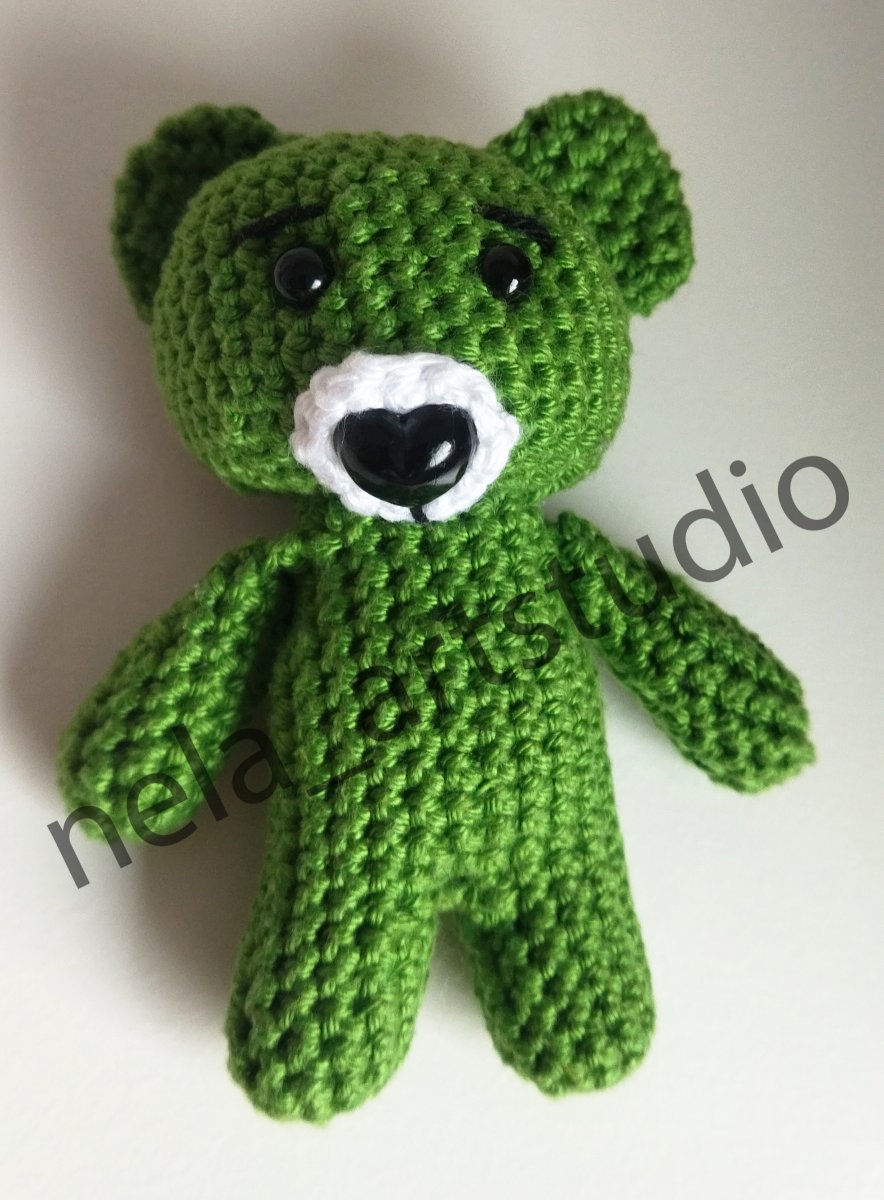 Háčkovaný háčkem 3,0 mm, vyplněn dutým vláknem. Obsahuje 2 ks bezpečnostních černých očí 6mm a čumák s bezpečnostní zarážkou proti vypadnutí.
