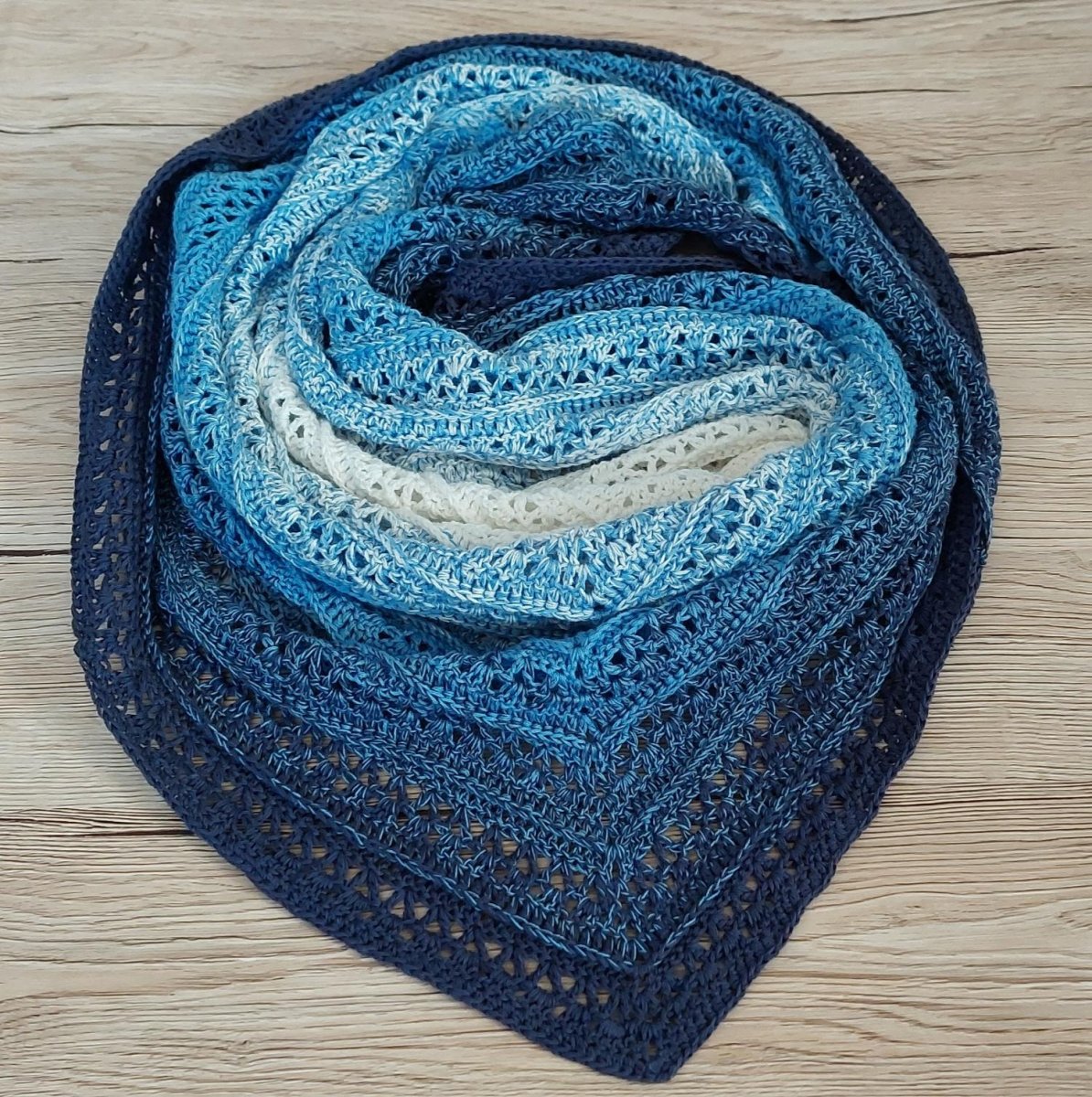 Velmi příjemný háčkovány šátek Elza. Šátek je vyroben z velmi příjemné směsové příze v odstínech modré. Šátek je úmyslně háčkován více do stran a délka k cípu je tak nižší. Zhotoven je z krásného duhového klubíčka s návinem 800 m.