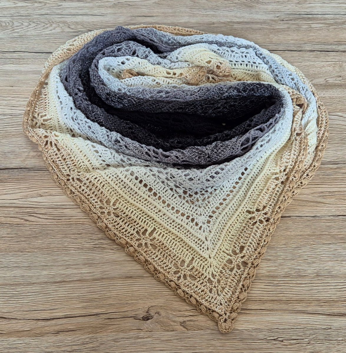 Šátek je uháčkovaný z velmi příjemné, nekousavé příze. Celkový návin je 1 200 m.