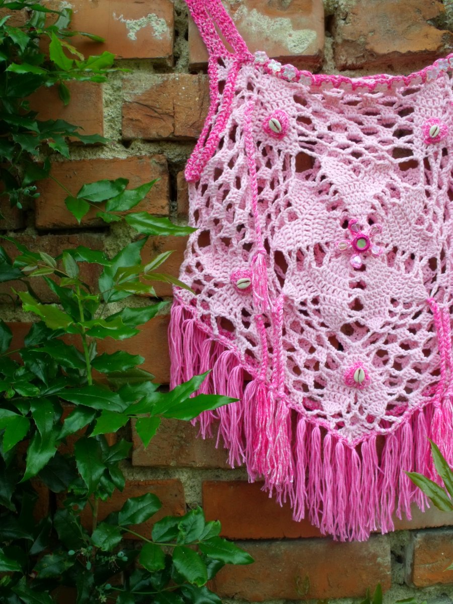 Přední i zadní díl má stejný srdíčkový vzor, přední díl je navíc ozdoben korálky, mušličkami, copánky upletenými ze stejné příze, zrcátkem a rolničkami. Spodní lem zdobí třásně.