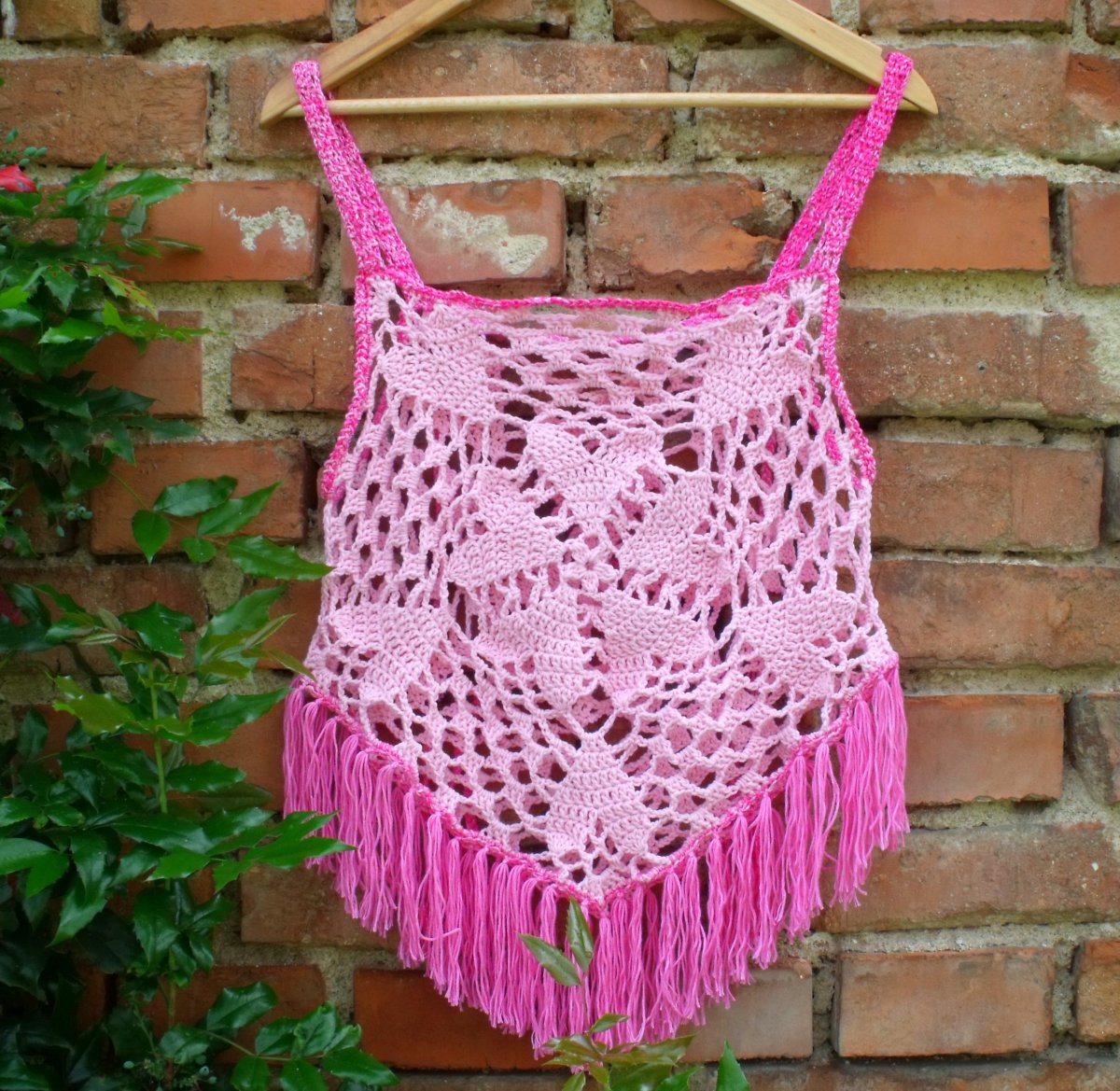 Originální top s třásněmi je uháčkovaný kombinací akrylových a bavlněných přízí.