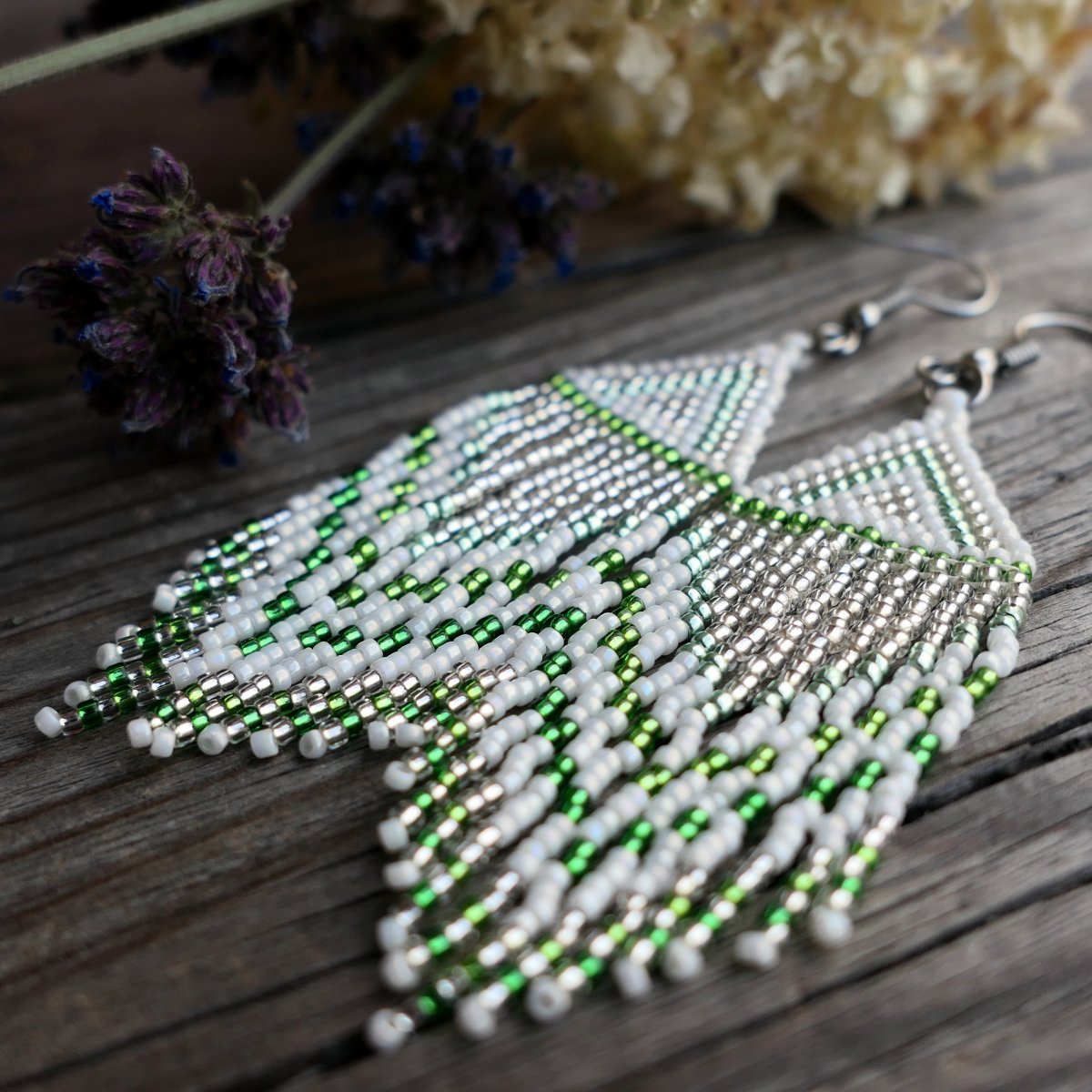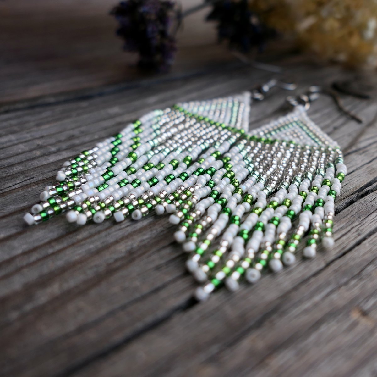 Dlouhé třásňové šité náušničky šířky 2,0 cm, zavěšené na otevřených háčcích z nerezové oceli. S korálkovými třásněmi mají náušničky (měřeno bez háčků) délku 6,5 cm.