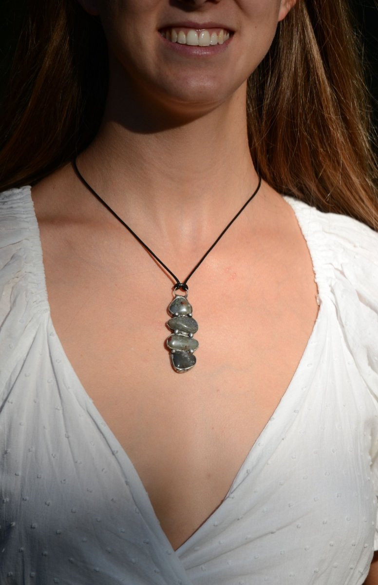 4 kameny HELIOTROPU spojené do jednoho šperku. Vyrobeno z bezolovnatého cínu. Černá patina, obroušena, takže dává šperku starostříbrný vzhled. Vše ošetřeno antioxidačním olejem a vyleštěno karnaubským voskem.