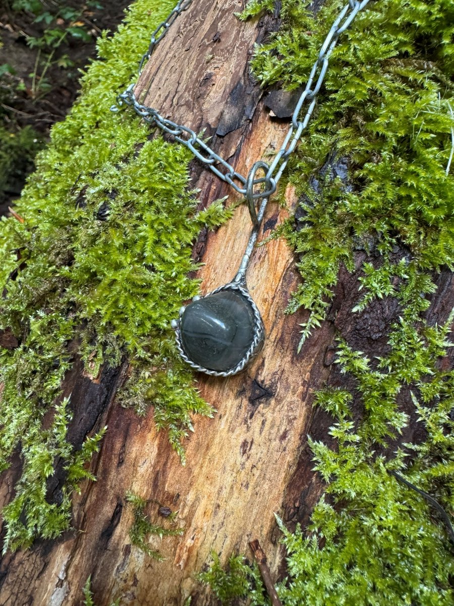 Vyrobeno z bezolovnatého cínu. Černá patina, obroušena, takže dává šperku starostříbrný vzhled. Vše ošetřeno antioxidačním olejem a vyleštěno karnaubským voskem.