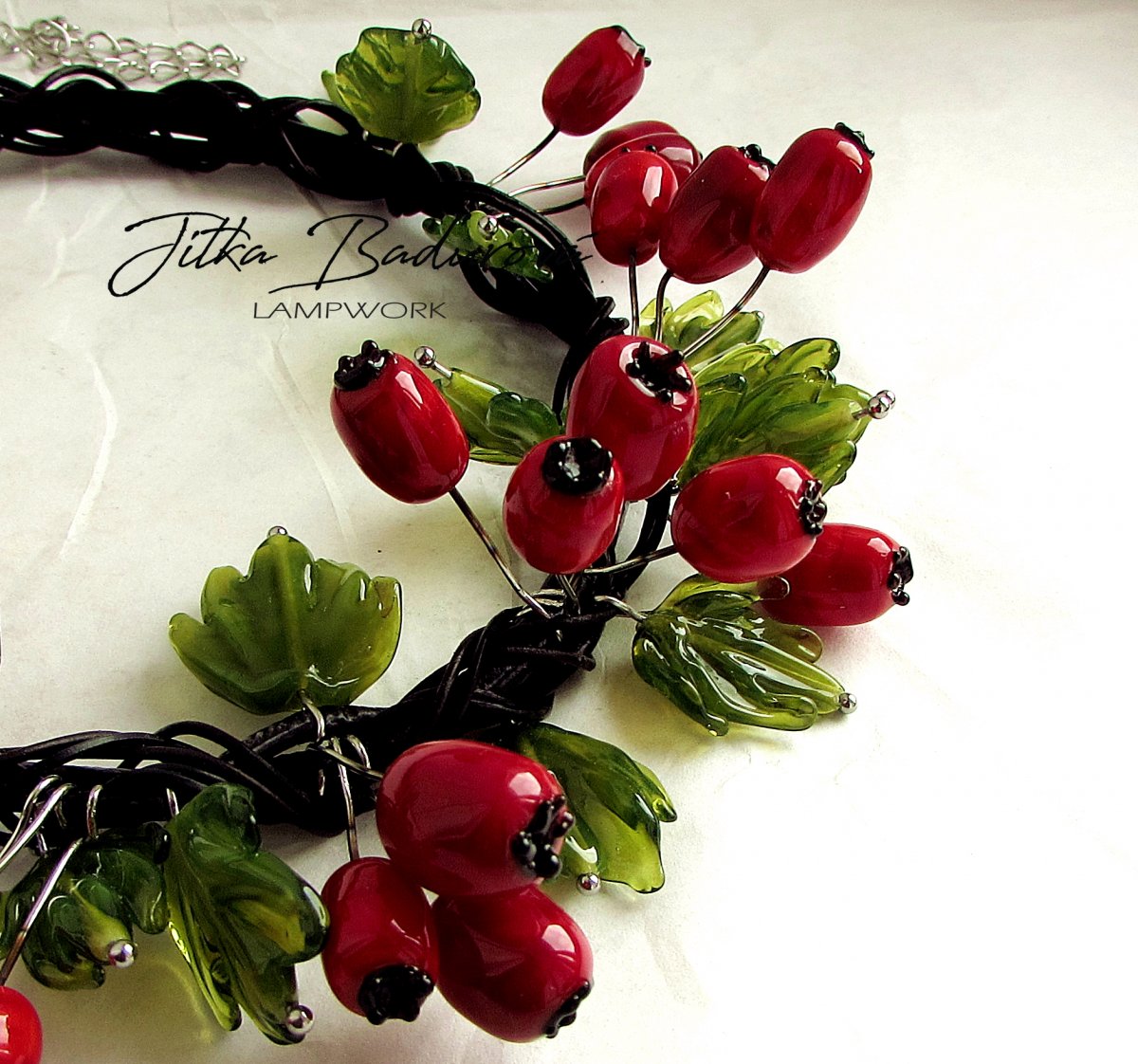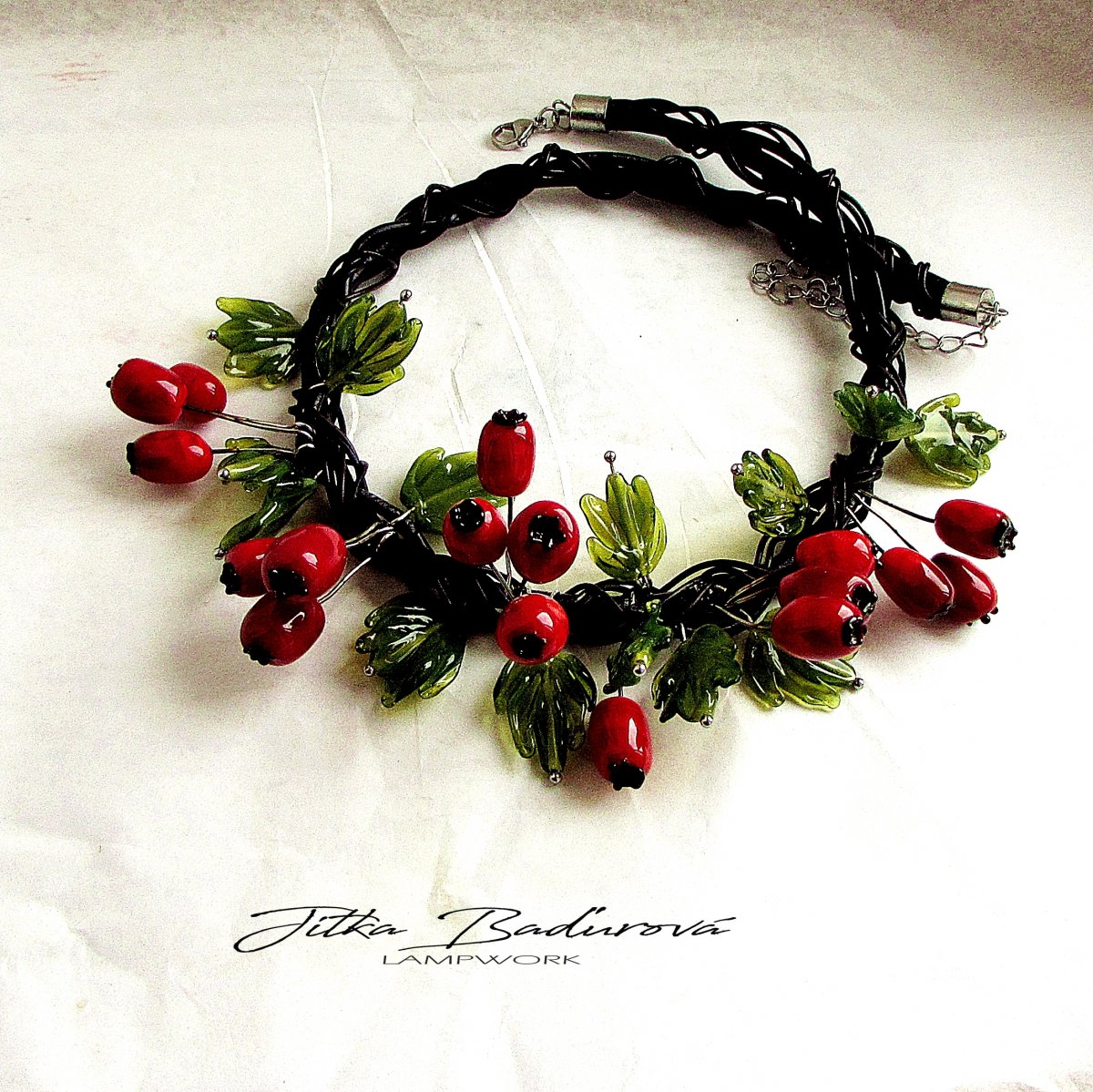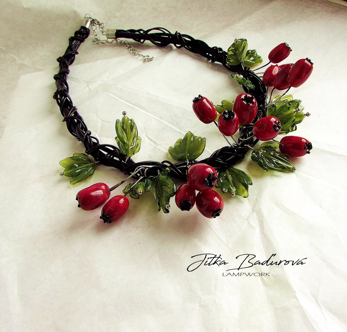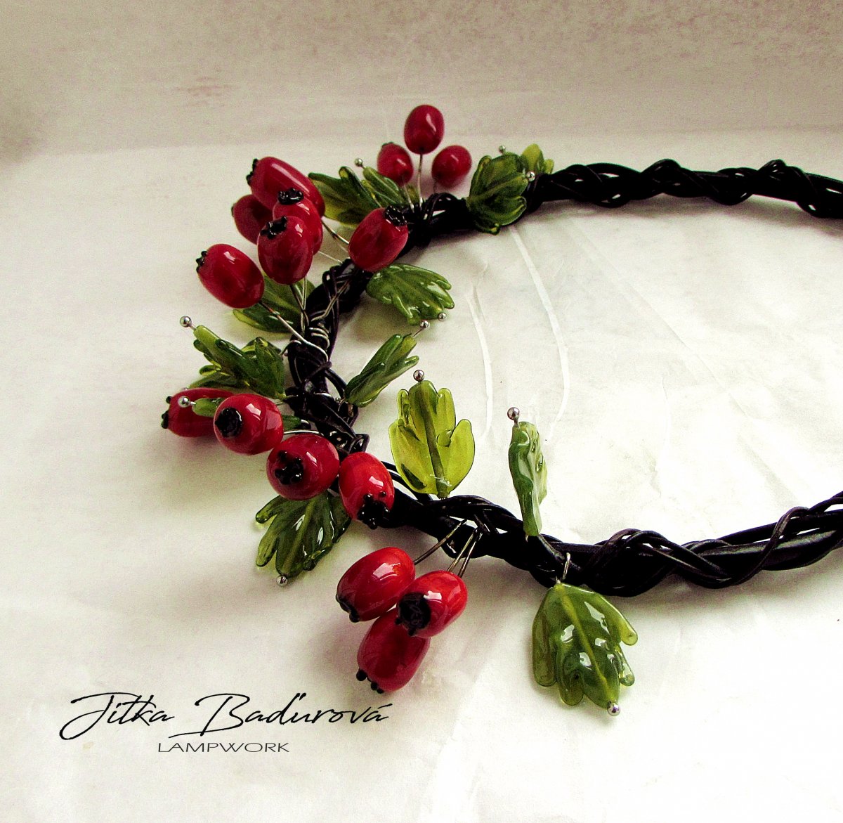 Náhrdelník na kůži, skleněné, ručně vinuté hlohy a lístky