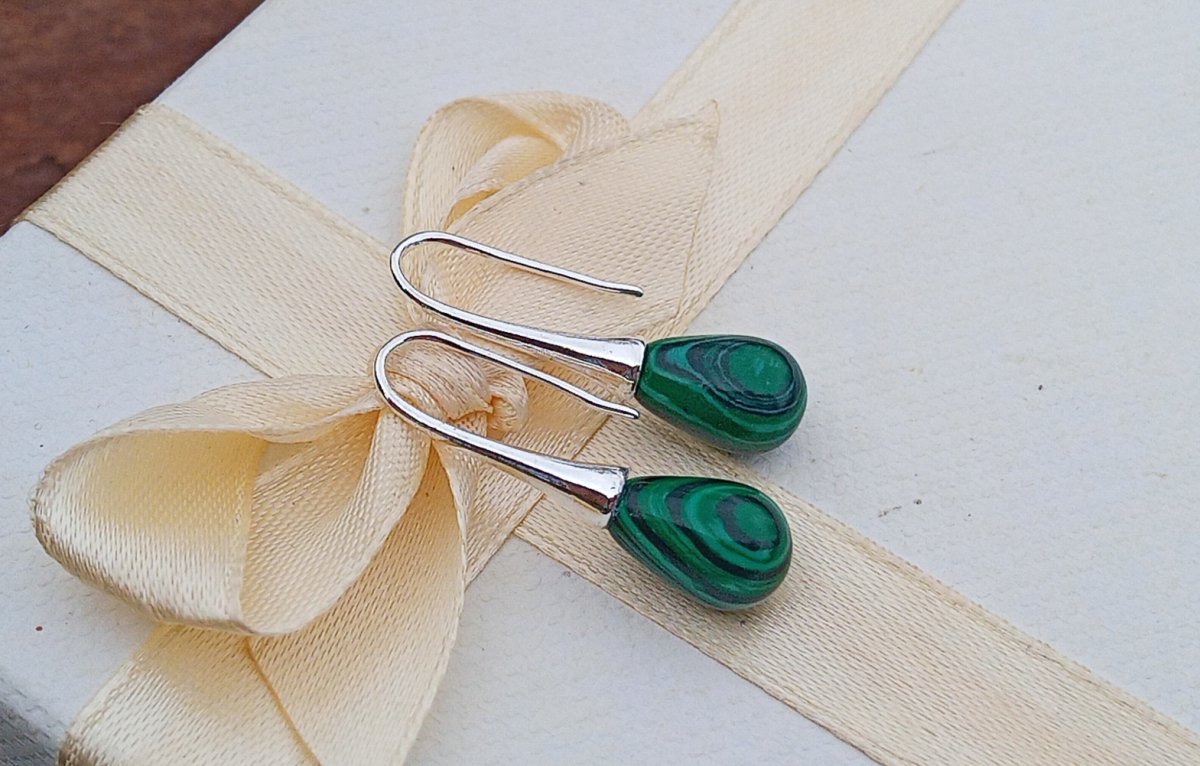 Dodejte svému stylu nádech luxusu a tajemna. Tyto náušnice v sytě zelené barvě s typickou kresbou malachitu jsou nepřehlédnutelným doplňkem, který v sobě spojuje eleganci kapkového tvaru s fascinující krásou přírodních vzorů.