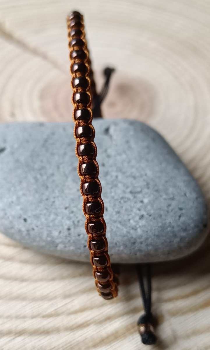 Náramek je vyroben z nylonové šňůry černé barvy a hnědo zlaté tenké šňůry.