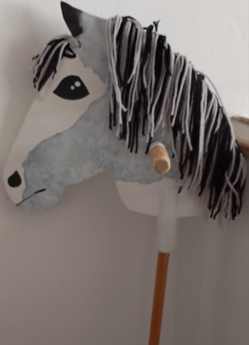 Ručně malovaný a vyřezaný koník na tyči s madlem.