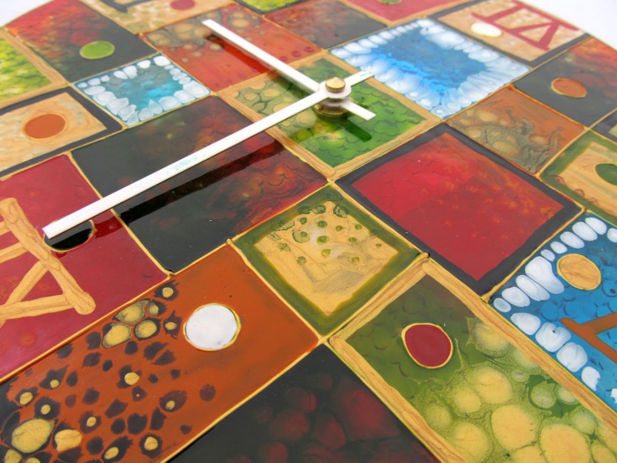 Oživte svou stěnu těmito nepřehlédnutelnými nástěnnými hodinami o průměru 33 cm. Ciferník je složen z ručně malovaných skleněných čtverců, které vytvářejí veselou a hravou mozaiku. Každý čtverec je originál – najdete zde syté barvy, organické vzory připomínající bubliny, mramorování i abstraktní tvary. Zlaté kontury dodávají hodinám punc elegance a hloubky. Místo klasických číslic jsou použity stylizované symboly a tečky, což jim dodává moderní a umělecký vzhled. Černé ručičky zajišťují snadnou čitelnost. Tyto hodiny nejsou jen ukazatelem času, jsou to jedinečný umělecký objekt, který přinese barvu a radost do každé místnosti. Jsou opatřeny kvalitním tichým strojkem, takže vás nebudou rušit tikáním.