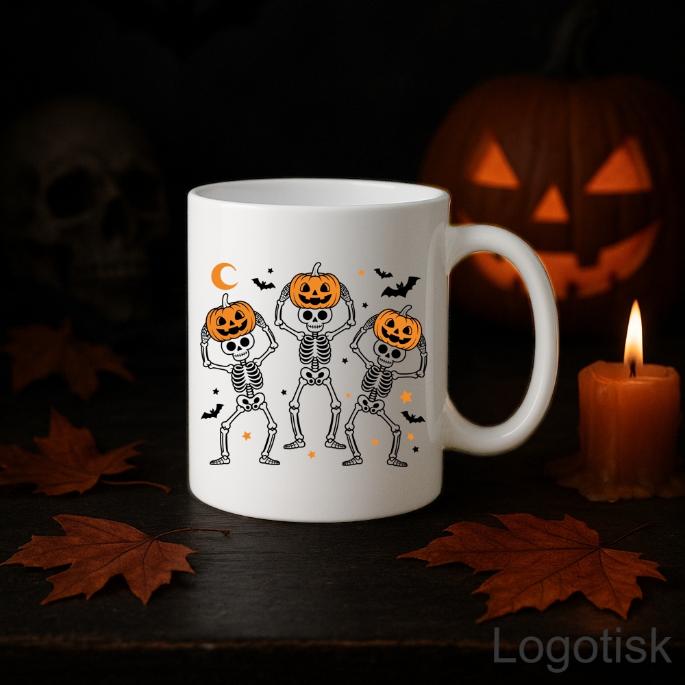 Hrnek s vtipným potiskem tančící KOSTLIVCI. Motiv na přední straně + jméno z druhé strany na přání.