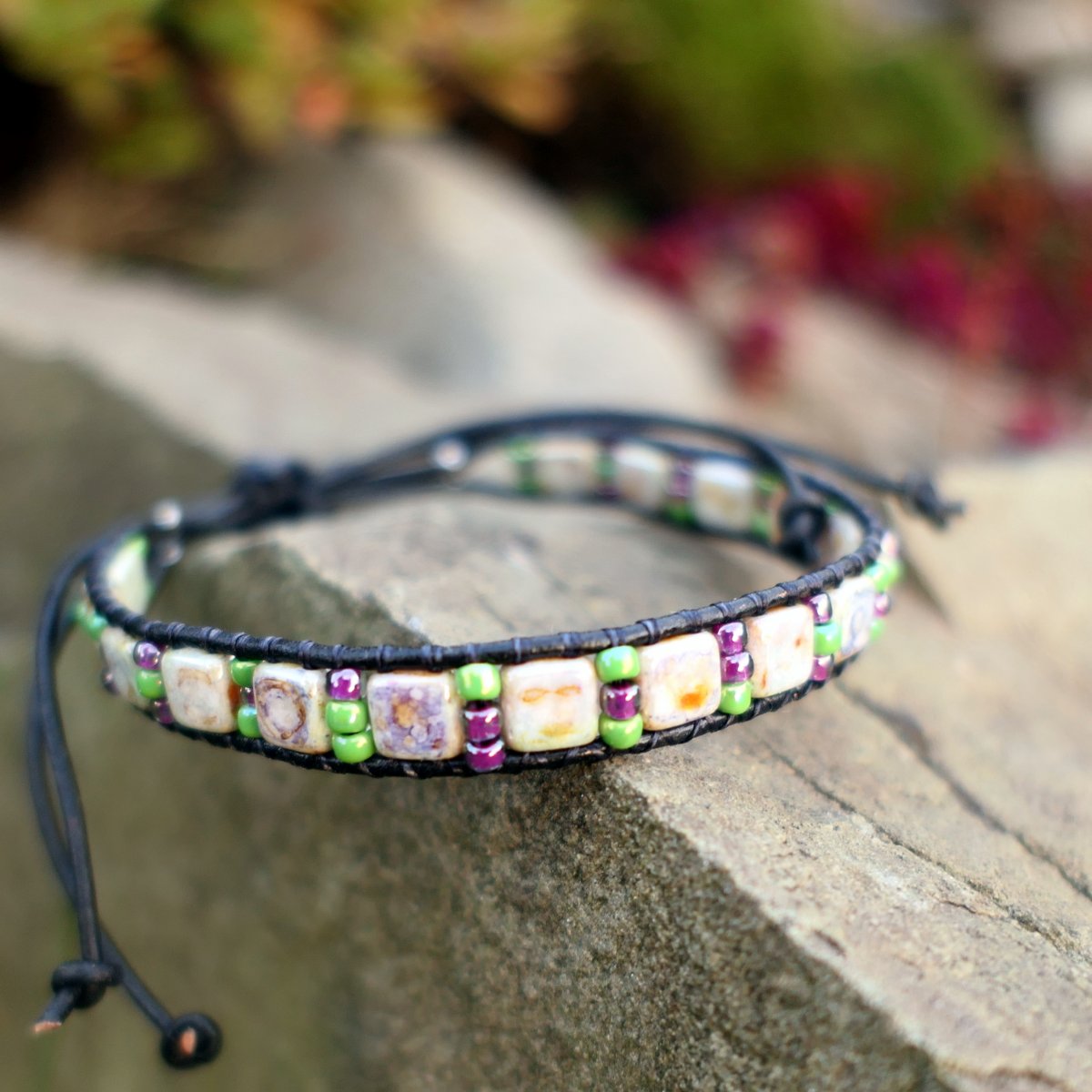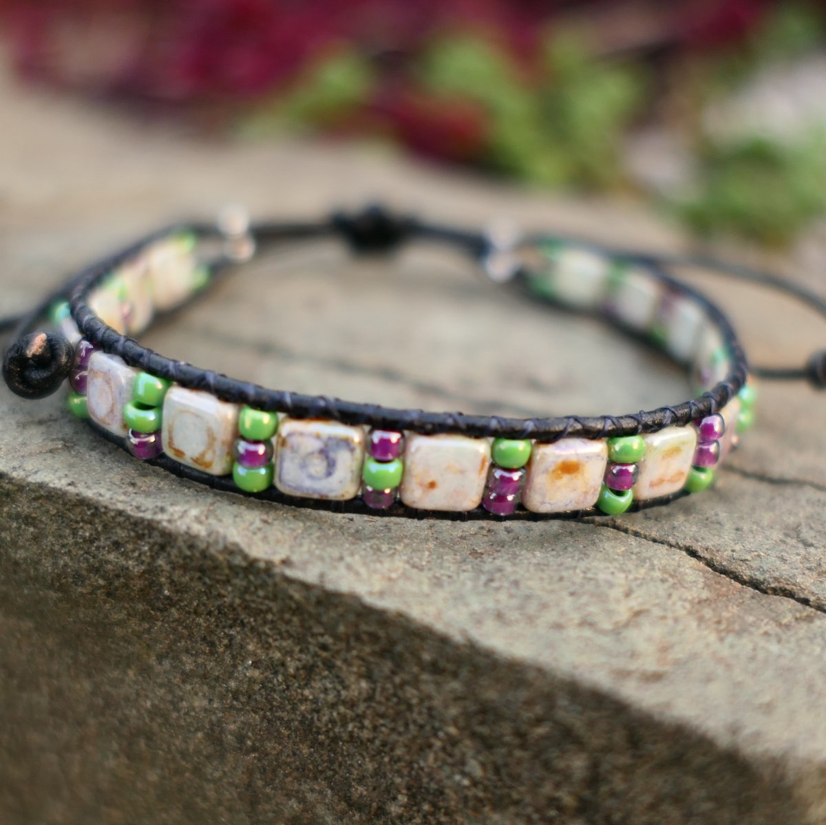 Úzký náramek s mačkanými kostičkami a rokajlem Toho v zelené a fialové barvě. Korálky jsou přišity mezi lakovanou kůži černé barvy. Náramek má roztahovací a stahovací uzlík.