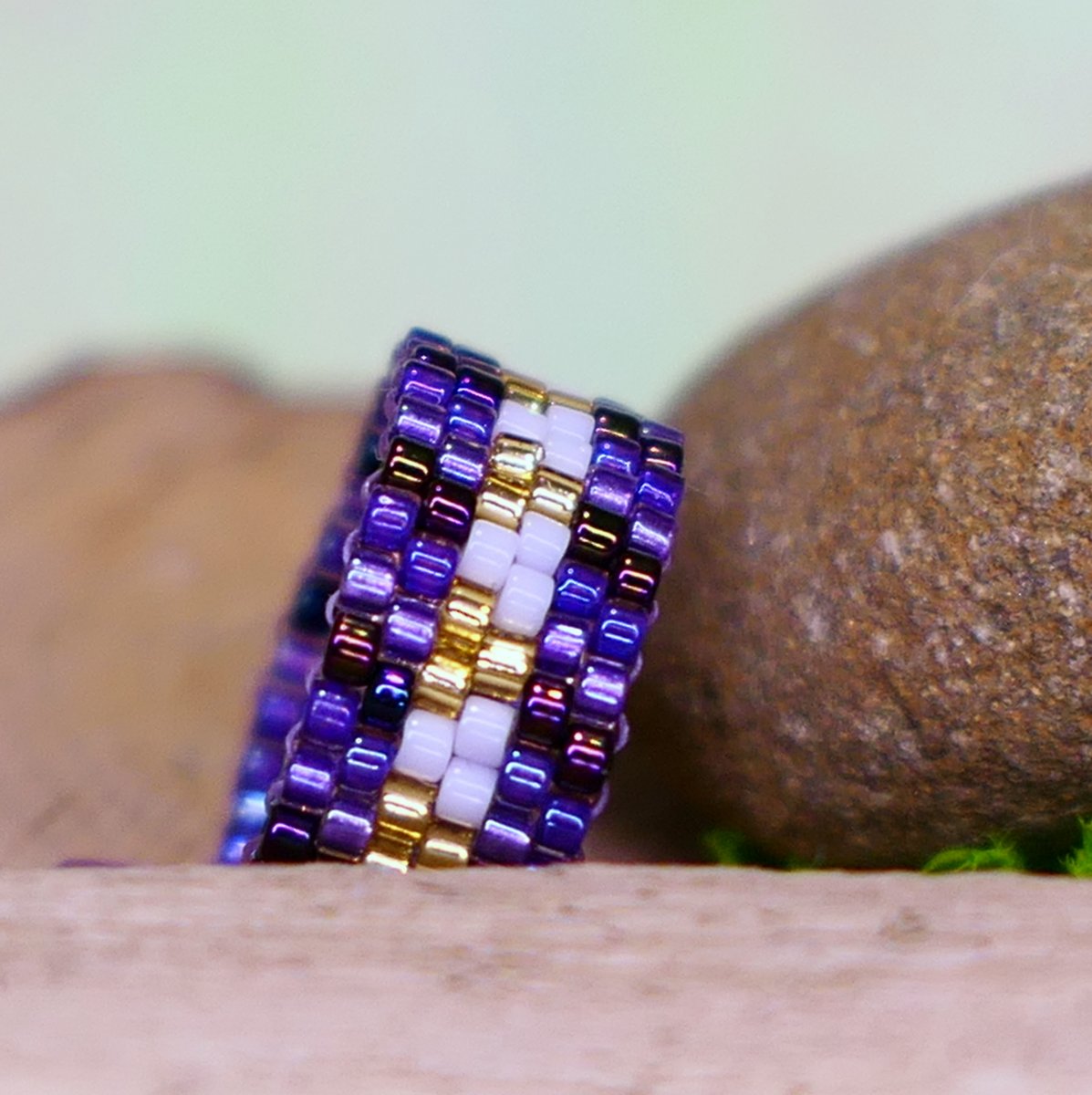 Šitý prsten z velmi kvalitních japonských korálků Treasure a Miyuki v barvě několika odstínů fialové, dále v bílé a zlaté barvě. Vzor není po celém obvodu. Šířka prstenu 0,8 cm.