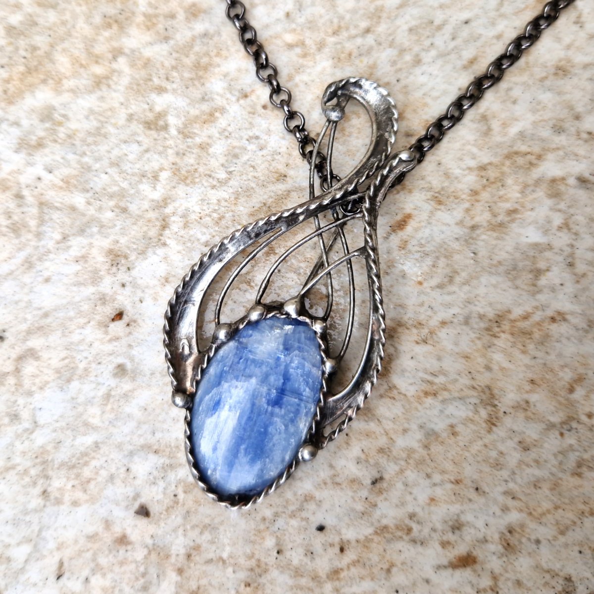 Cínovaný, patinovaný, následně leštený náhrdelník z krásně vybarveného kabošonu kyanitu