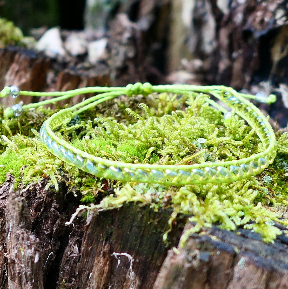 Úzký náramek s mačkanými korálky miniduo v zelené barvě, s listrem AB. Korálky jsou vetkány mezi kvalitní voskovanou šňůrku Linhasita zelené barvy, zapínání na posuvný uzlík. Šňůrky ukončeny čírými korálky se stříbrným půlpokovem.