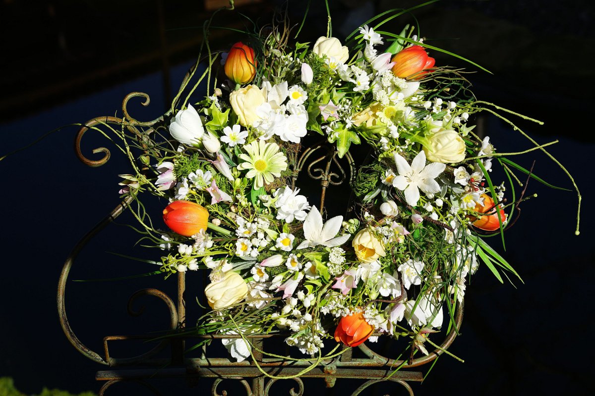 Pestrý jarní věnec ve volném vzdušném provedení. Tulipány jsou latexové a pěnové a působí velmi realisticky. Hlavní průměr věnce je 35cm, po špičky zelených větviček, které jsou tvarovatelné může mít věnec až 50+ cm.