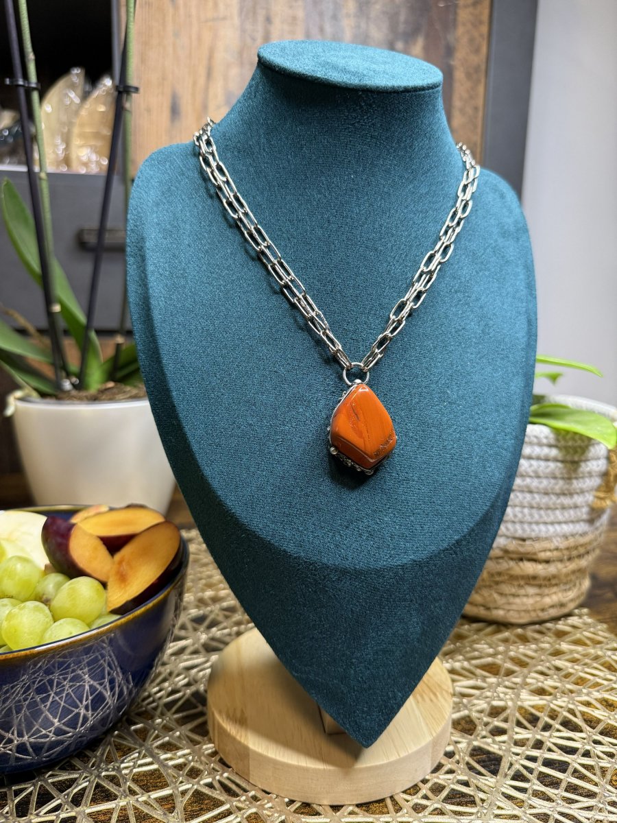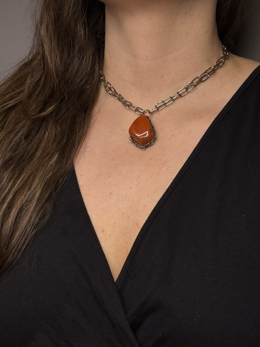 Náhrdelník s červeným JASPISEM. Vyrobeno z bezolovnatého cínu. Černá patina, obroušena, takže dává šperku starostříbrný vzhled. Vše ošetřeno antioxidačním olejem a vyleštěno karnaubským voskem.