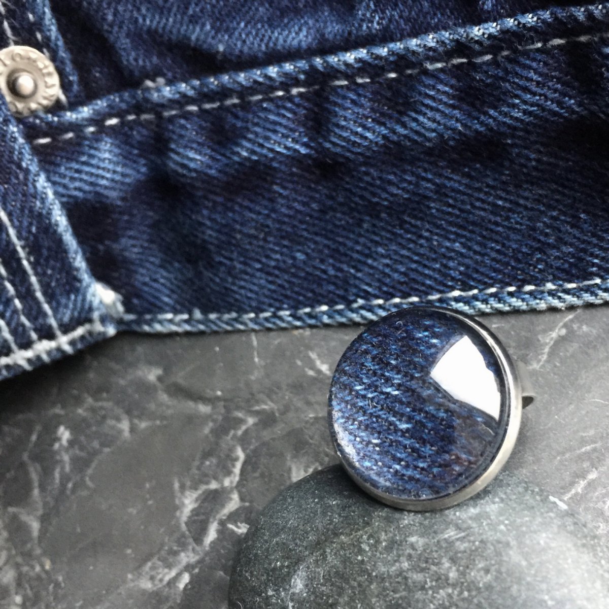 Prstýnek z nerez oceli s tmavě modrou riflovinou pod skleněným kabošonem. Lůžko má průměr 20 mm.