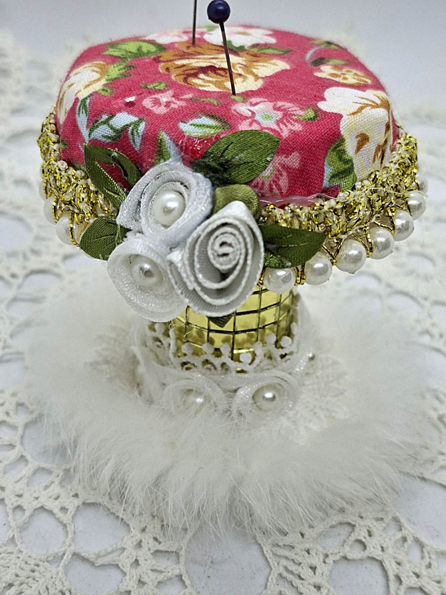 Ručně vytvořený jehelníček, který není jen praktickou pomůckou, ale i dekorací šicího koutku.