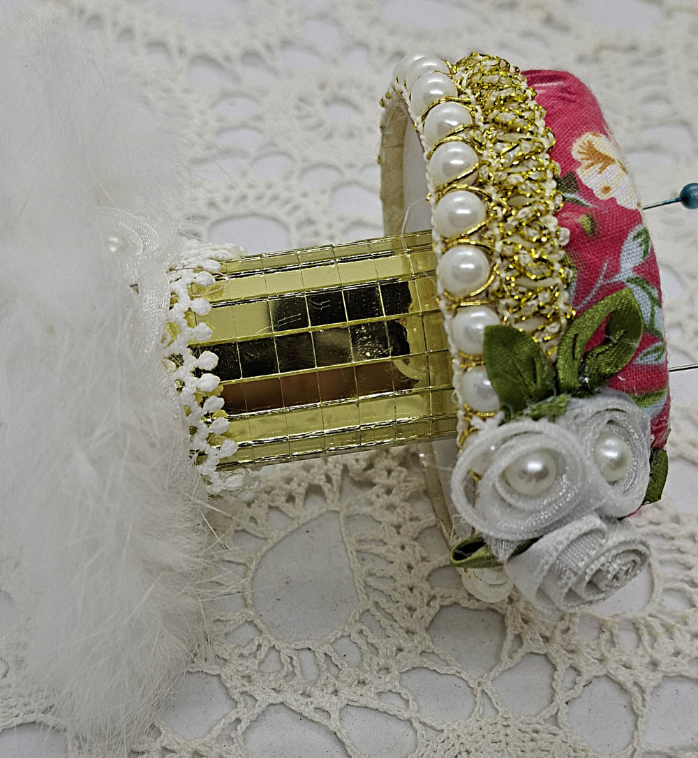 Vintage látka, jemná krajka a  korálkové zdobení mu dávají vzhled malého šperku.