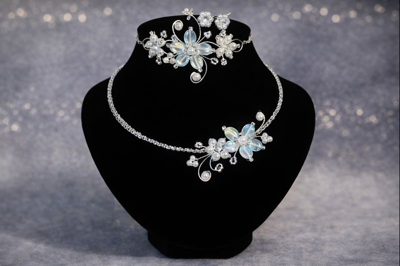 Sada obsahuje náhrdelník, náramek a náušnice, které spolu dokonale ladí a vytvářejí harmonický celek. Šperky jsou lehké, pohodlné na nošení a krásně doplní společenské šaty, šaty pro družičky, plesový nebo slavnostní outfit.
