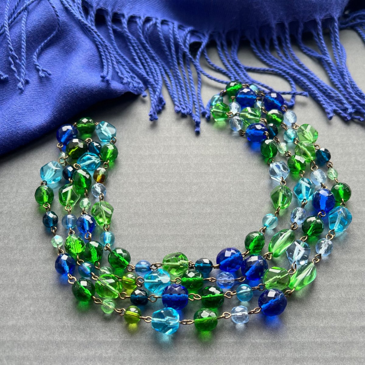 Dlouhý ketlovaný náhrdelník z větších skleněných broušených korálků. Délka 136 cm, lze omotat 2x kolem krku. Bez zapínání - na přání můžu přidělat karabinku
