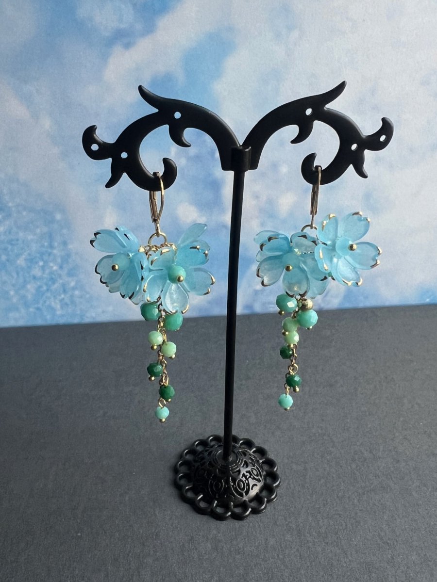 Dlouhé náušnice s plastovými květinkami a drobnými broušenými korálkami na pozlacených kroužkách a řetízku z pozlacené nerez oceli. Délka od háčku cca 6 cm, uzavíratelný háček z nerez oceli