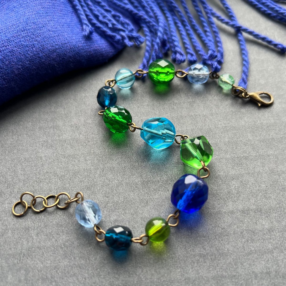 Ketlovaný náramek z broušených skleněných korálků. Délka 19 cm, zapínání na karabinku, prodlužující řetízek (max 22 cm), délku můžu na přání upravit