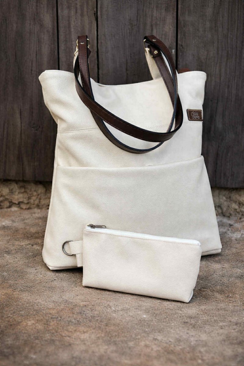 Tašku zdobí krásná ucha v kontrastní hnědé barvě.