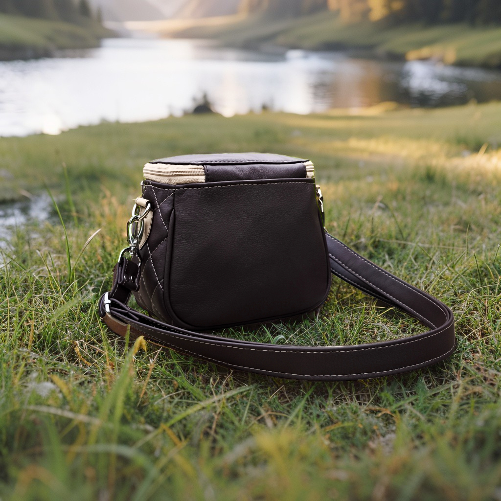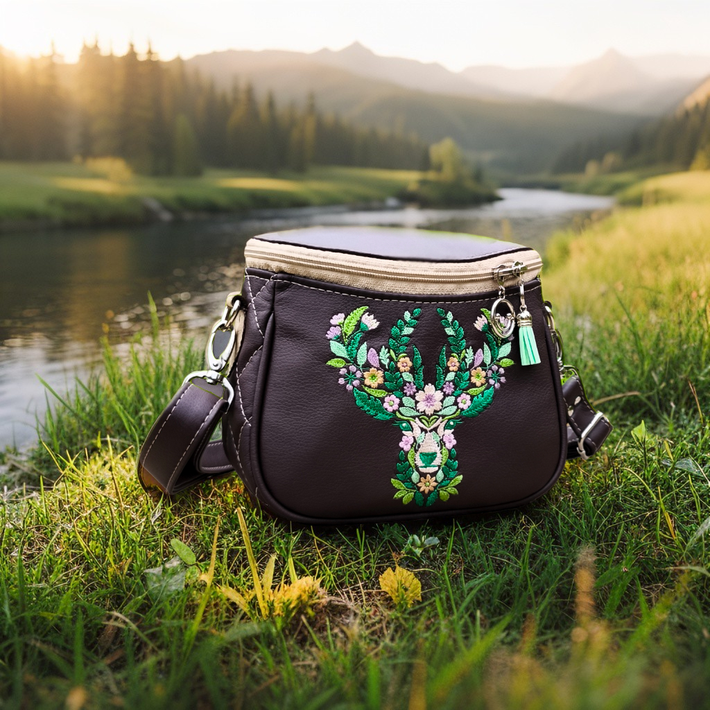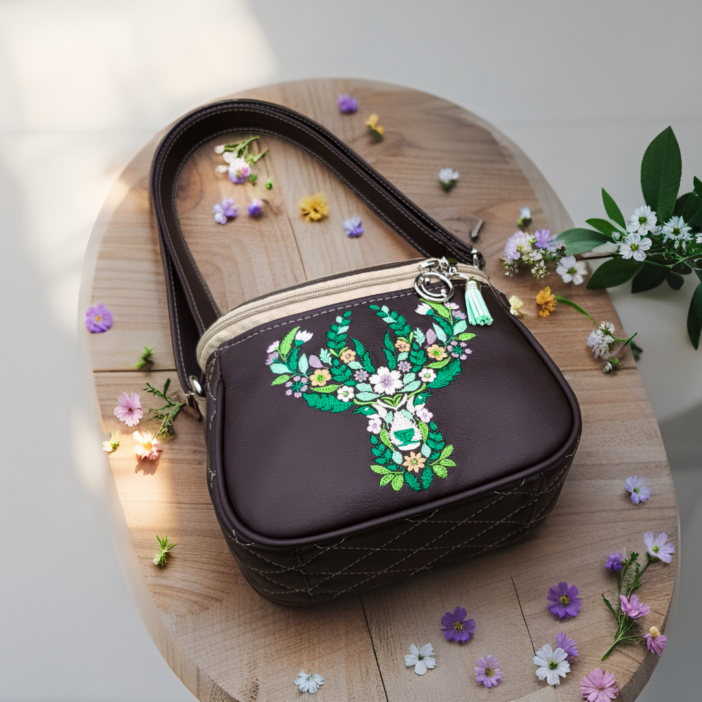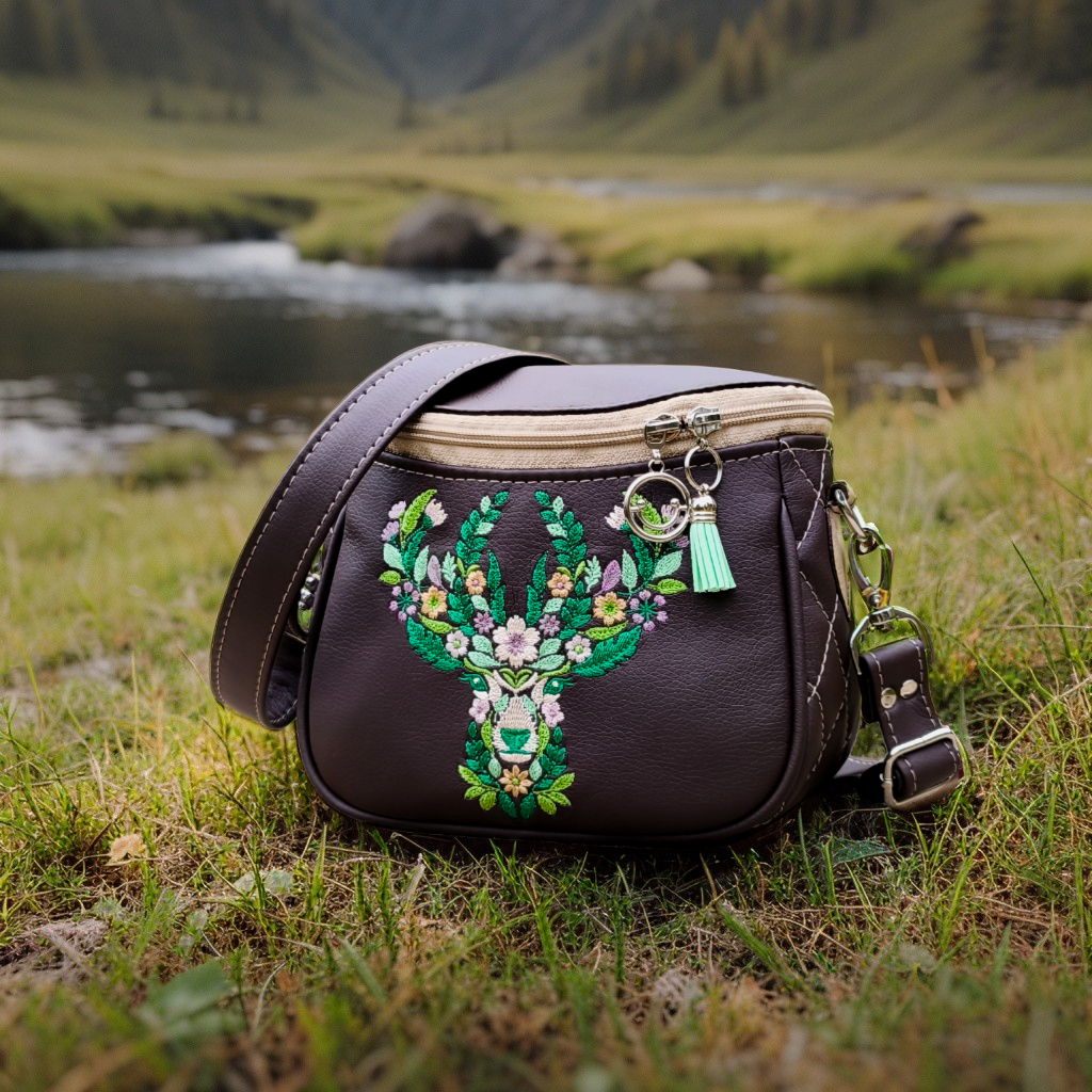 Menší baculatá kabelka je ušita z tmavě hnědé koženky, ozdobená výšivkou.Vstup do kabelky se uzavírá zipem s béžovou spirálou na dva jezdce (lze nosit na obou stranách těla).